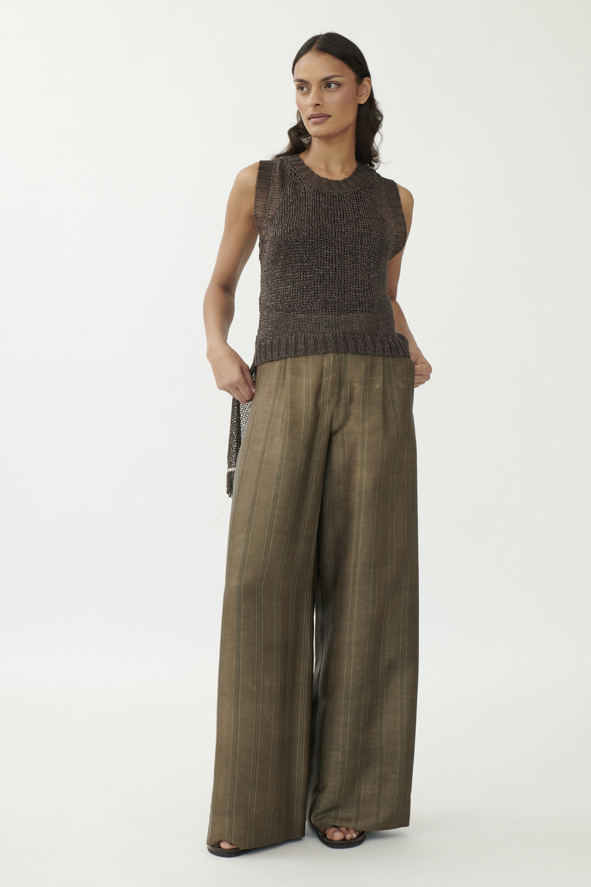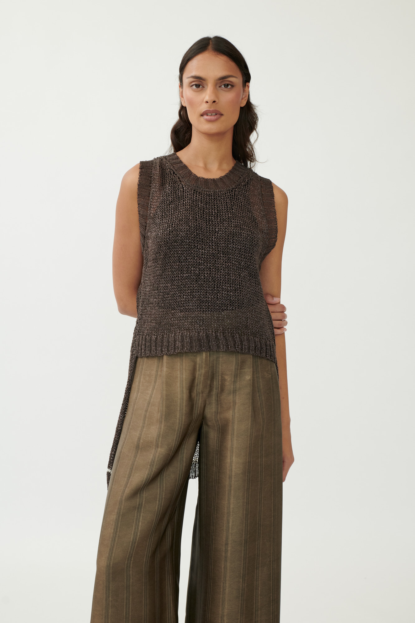 Ein Spiel mit Proportionen und Transparenz. Unser lässiges Stricktop ist vorne kürzer geschnitten, während das Rückenteil verlängert ist und mit einem farblich abgesetzten Akzentfaden überrascht. Der locker gestrickte Materialmix aus Viskose, Leinen und Baumwolle sorgt für ein luftiges Tragegefühl. Breite Rippenkanten und seitliche Schlitze runden das Design ab.