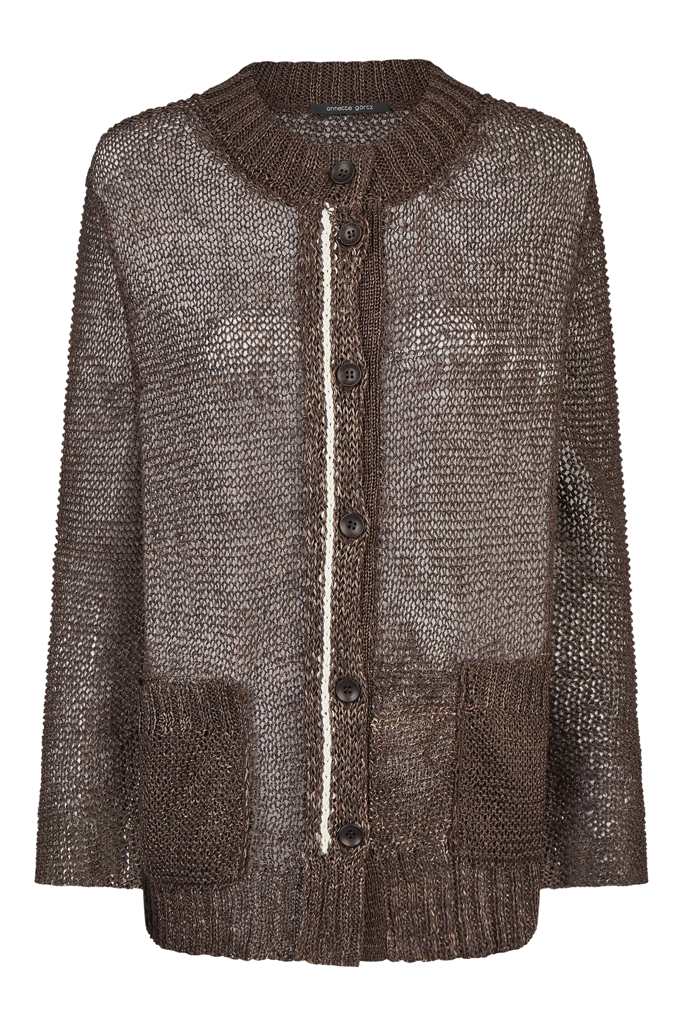 Unsere locker gestrickte Strickjacke überzeugt mit Transparenz und entspannter Weite. Aufgesetzte Beuteltaschen und Rippenabschlüsse an Arm und Halsausschnitt sorgen für Struktur. Ein farblich abgesetzter Akzentfaden entlang der Knopfleiste verleiht dem Modell einen dezenten Twist.