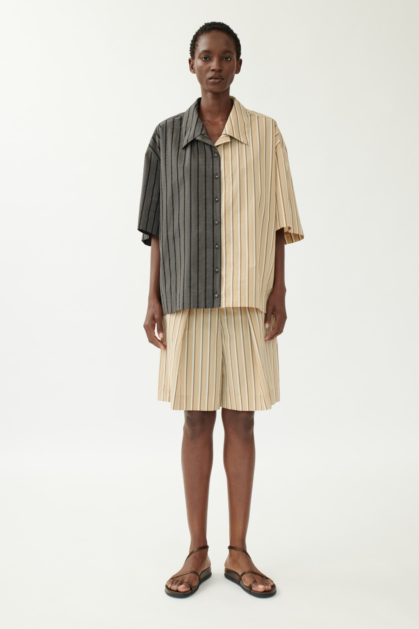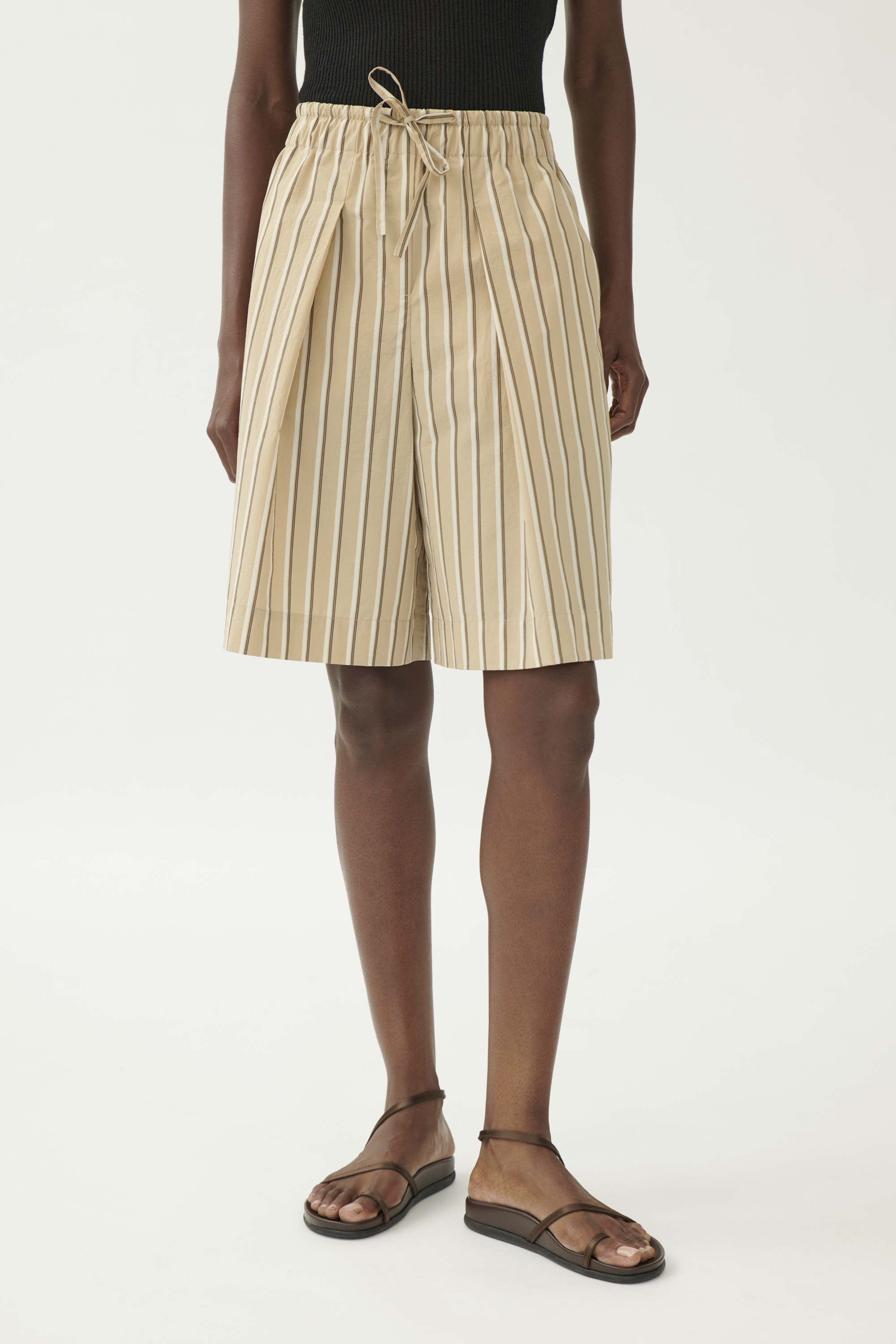 Diese weiten Shorts aus feinem, gestreiftem Popelin kombinieren Komfort und Klarheit. Der elastische Bund mit Tunnelzug sorgt für flexible Passform, während Bundfalten und Taschenstruktur dem Design Tiefe verleihen. Ideal für warme Tage – leicht, luftig und dennoch präzise in der Silhouette.