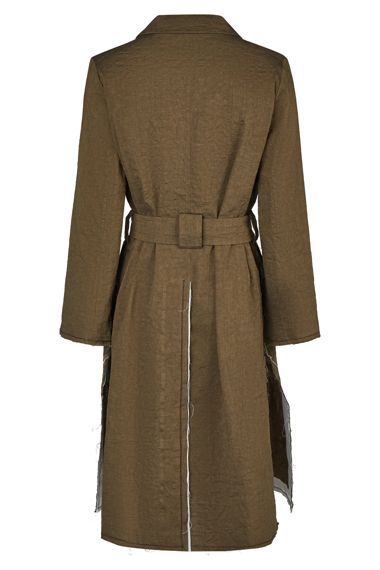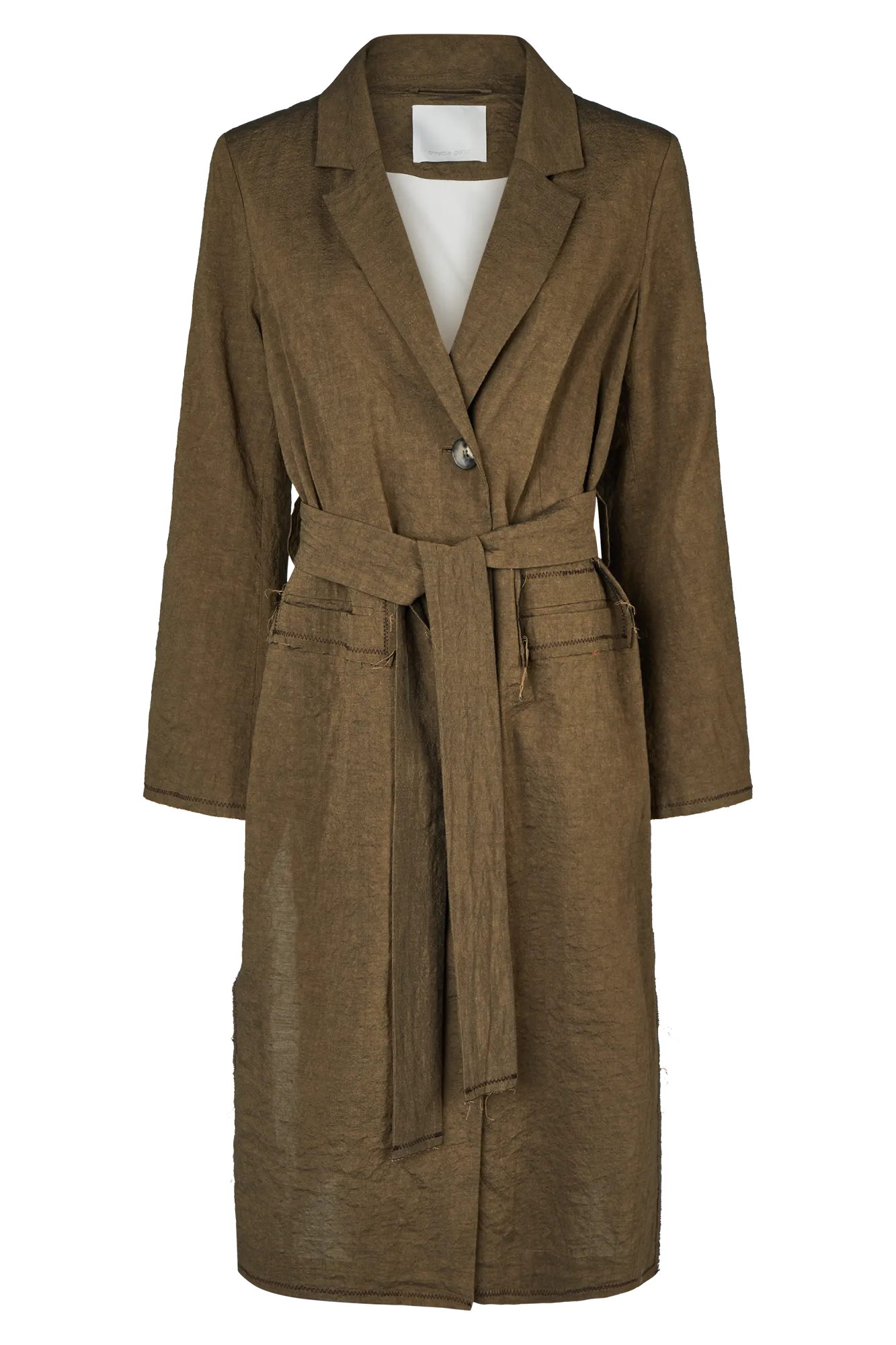 Dieser gerade geschnittene Mantel kombiniert reduzierte Formensprache mit subtilen Handwerkszitaten. Offenkantige Abschlüsse mit kontrastierendem Besatz, ausgestellte Ärmel und Zick-Zack-Steppungen betonen den handwerklichen Anspruch und verleihen dem Modell eine besondere Struktur. Das gewaschene Leinen-Baumwoll-Gewebe sorgt für angenehme Haptik und eine lebendige Oberfläche.