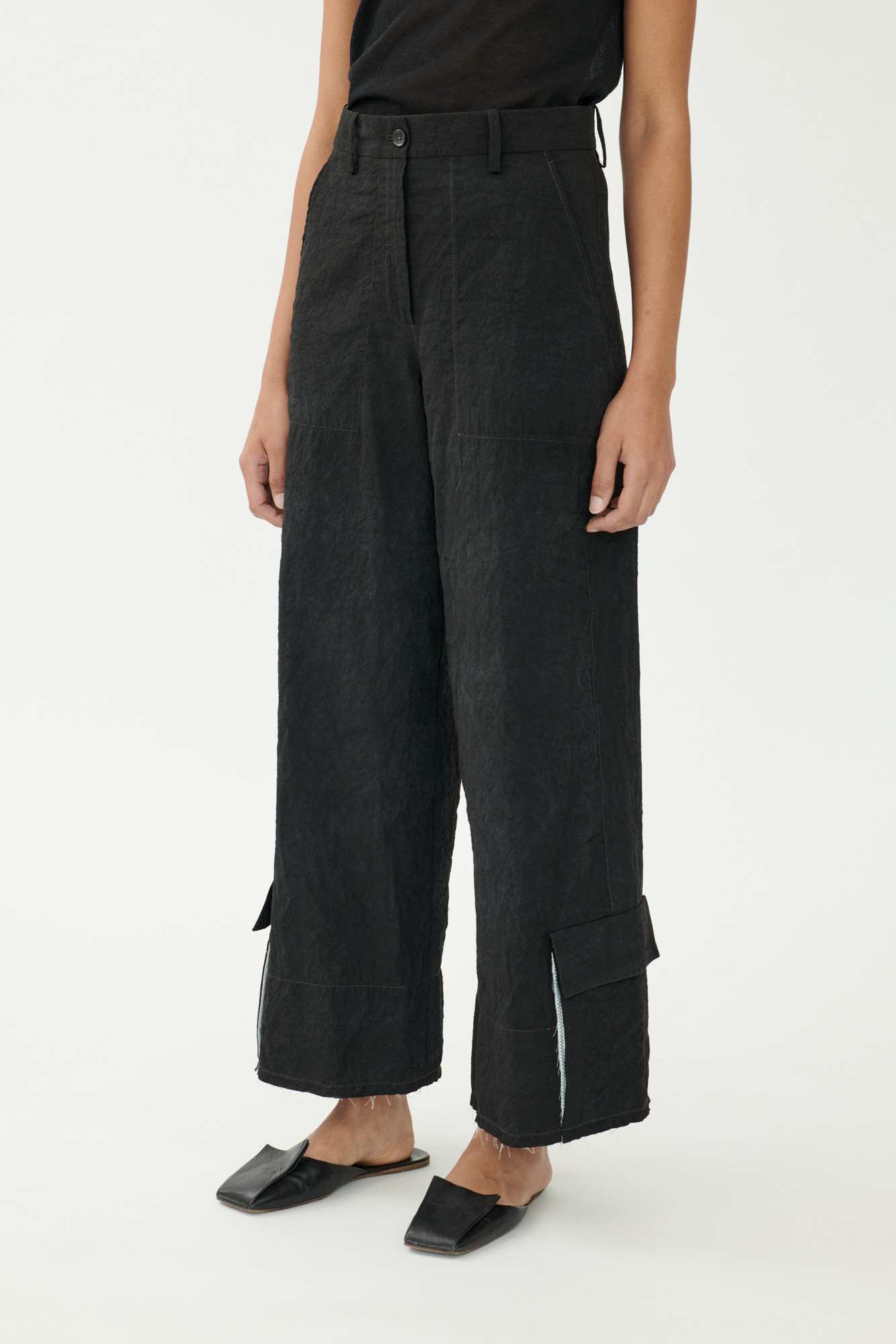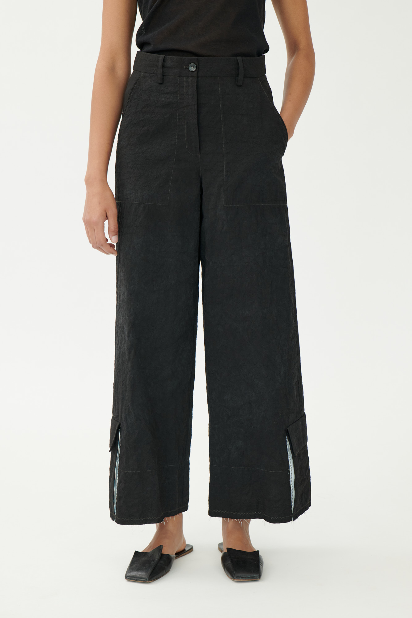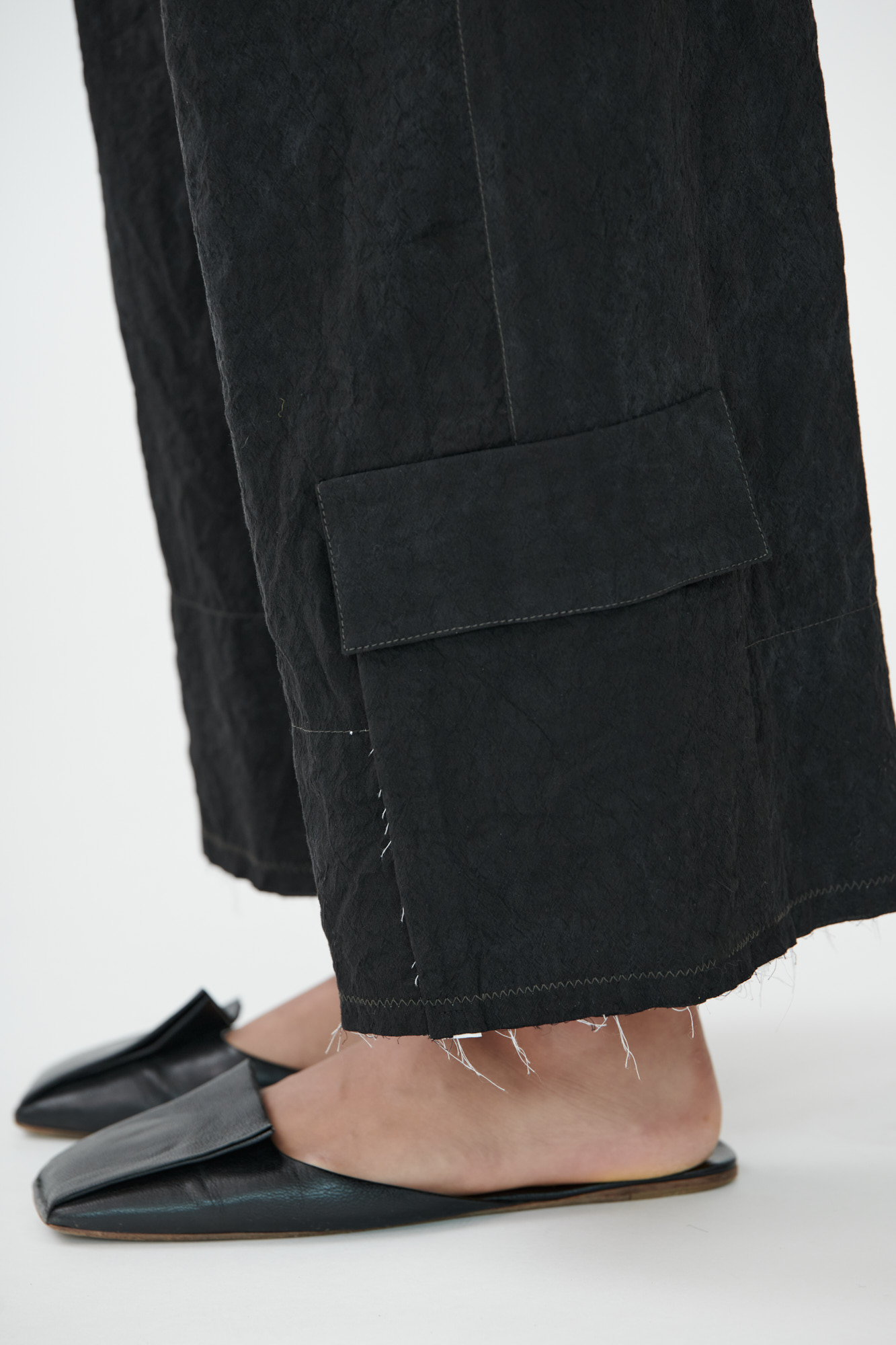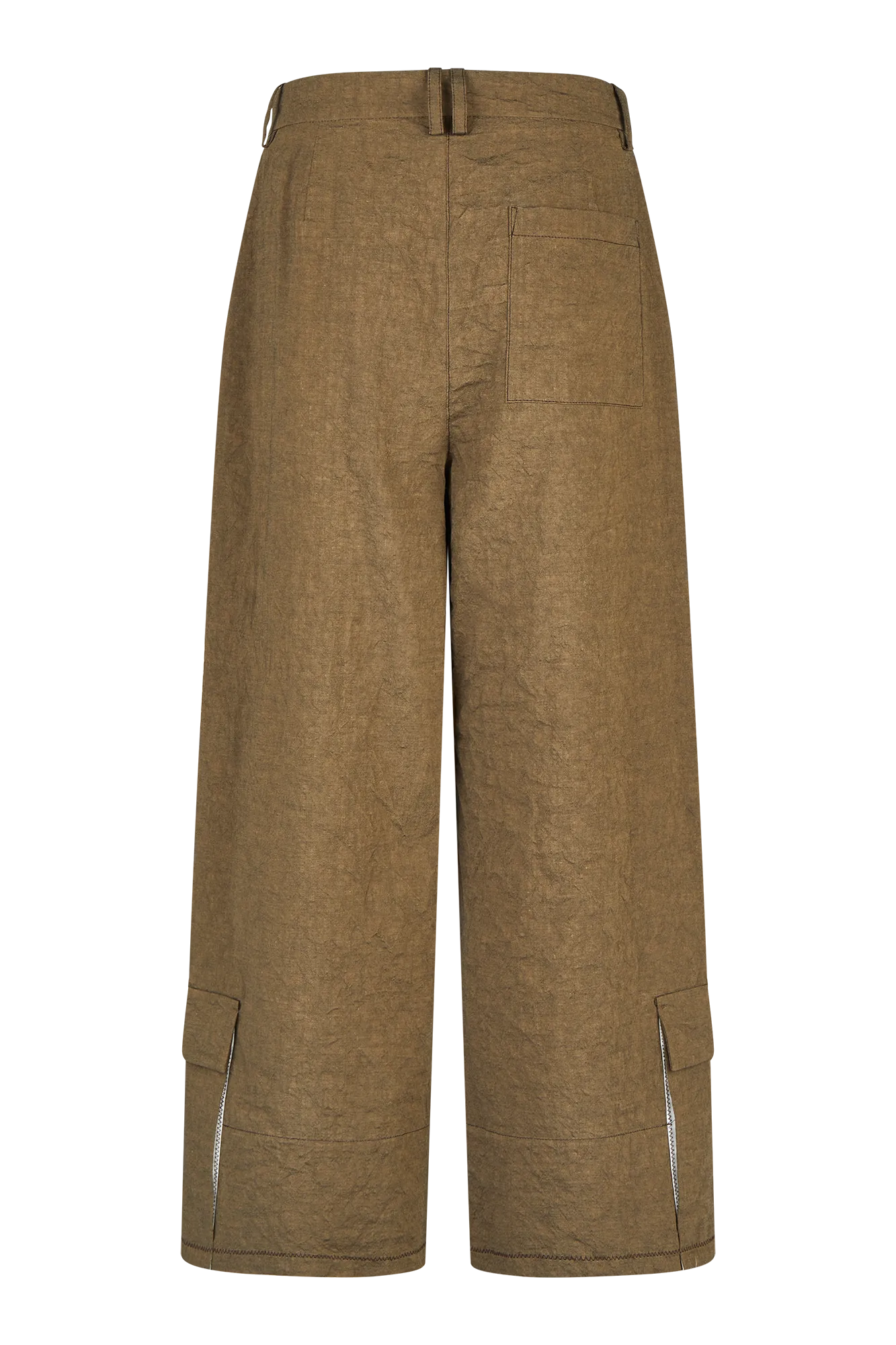 Diese weit geschnittene Hose kombiniert sportliche Funktion mit einem reduzierten Design. Cargotaschen, offene Saumkanten mit Kontrastbesatz und markante Zick-Zack-Steppungen stehen für eine stille Hommage an das Handwerk – sichtbar gemacht durch ehrliche, rohe Verarbeitungsdetails.