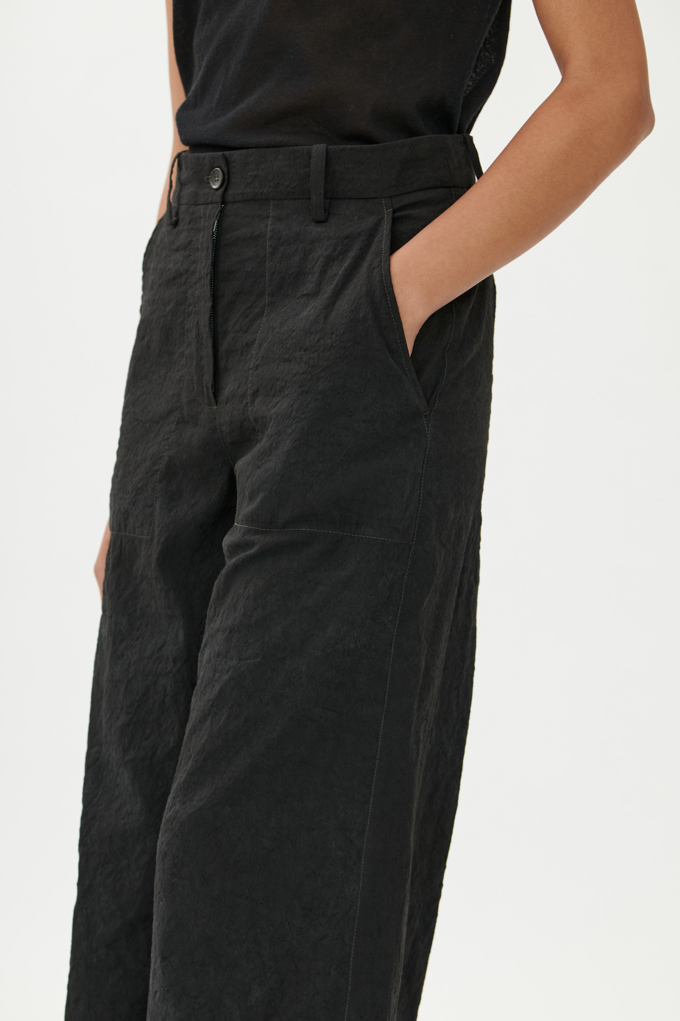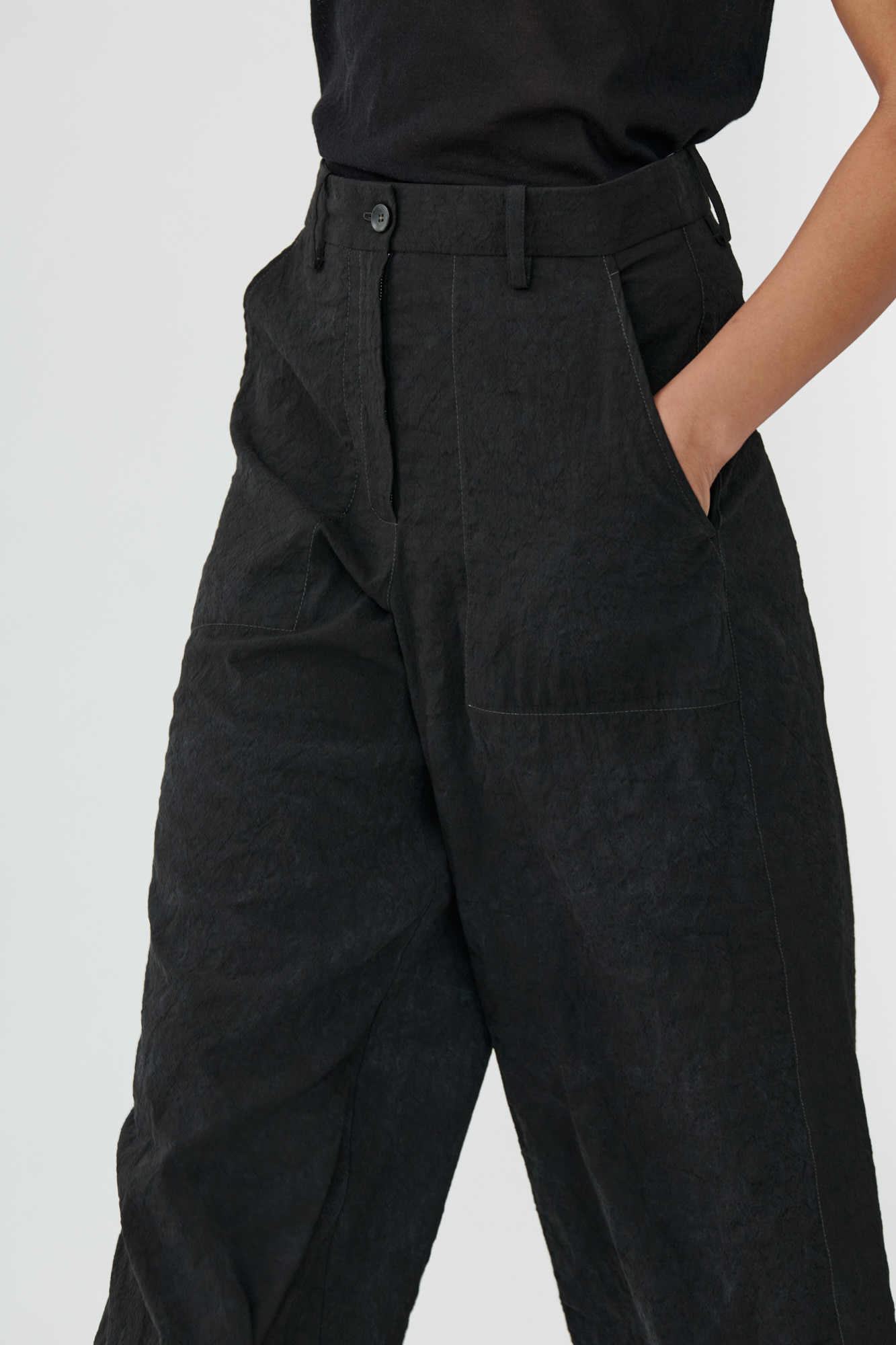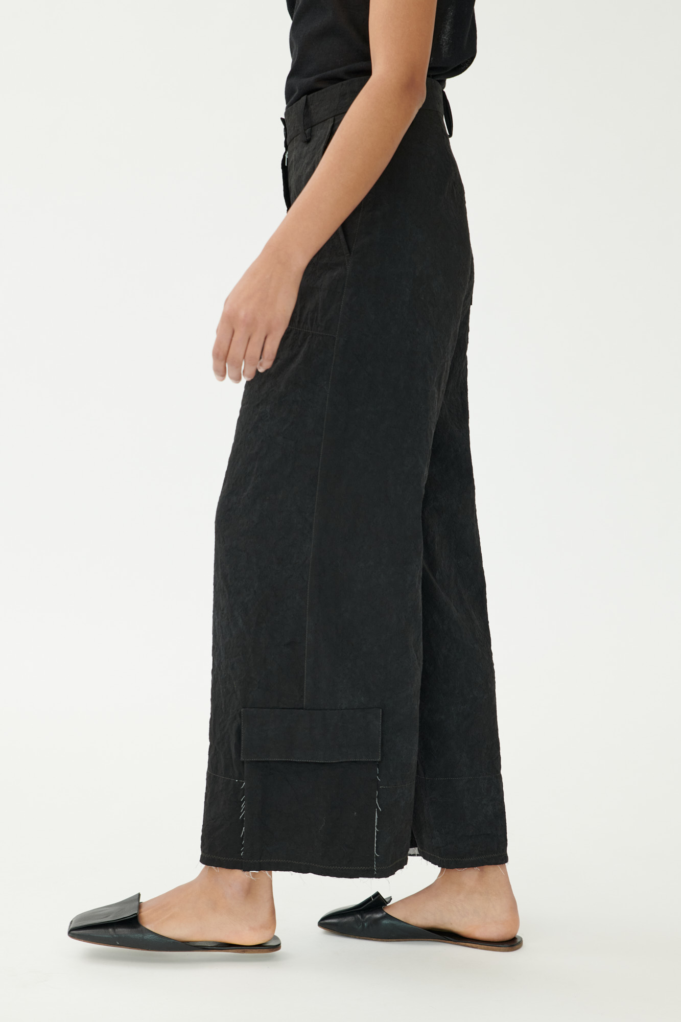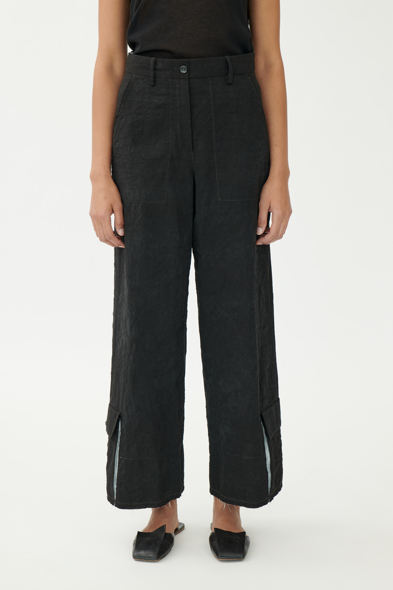 Diese weit geschnittene Hose kombiniert sportliche Funktion mit einem reduzierten Design. Cargotaschen, offene Saumkanten mit Kontrastbesatz und markante Zick-Zack-Steppungen stehen für eine stille Hommage an das Handwerk – sichtbar gemacht durch ehrliche, rohe Verarbeitungsdetails.