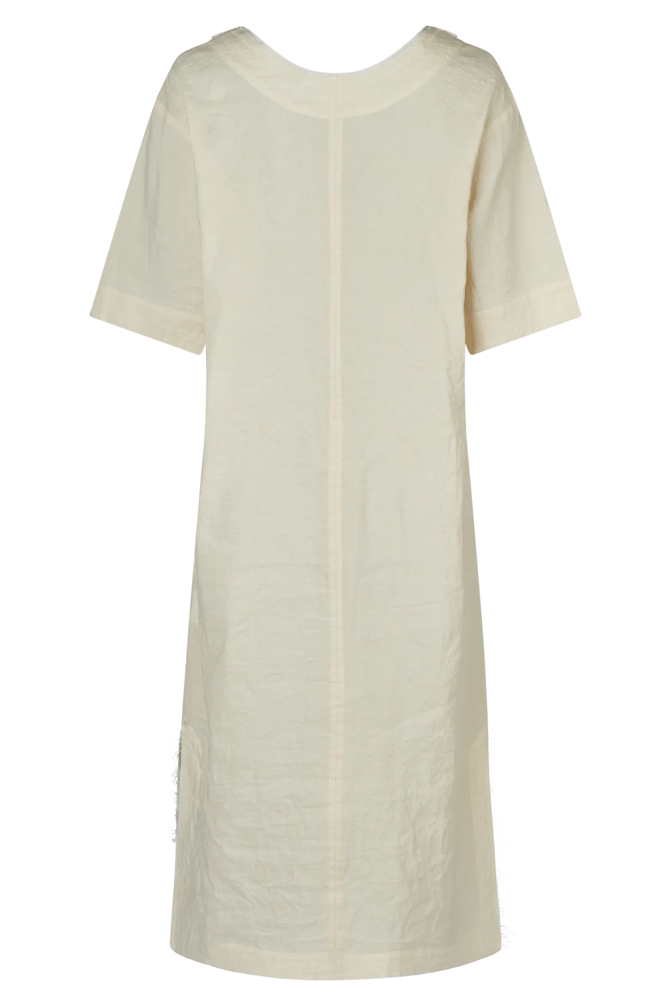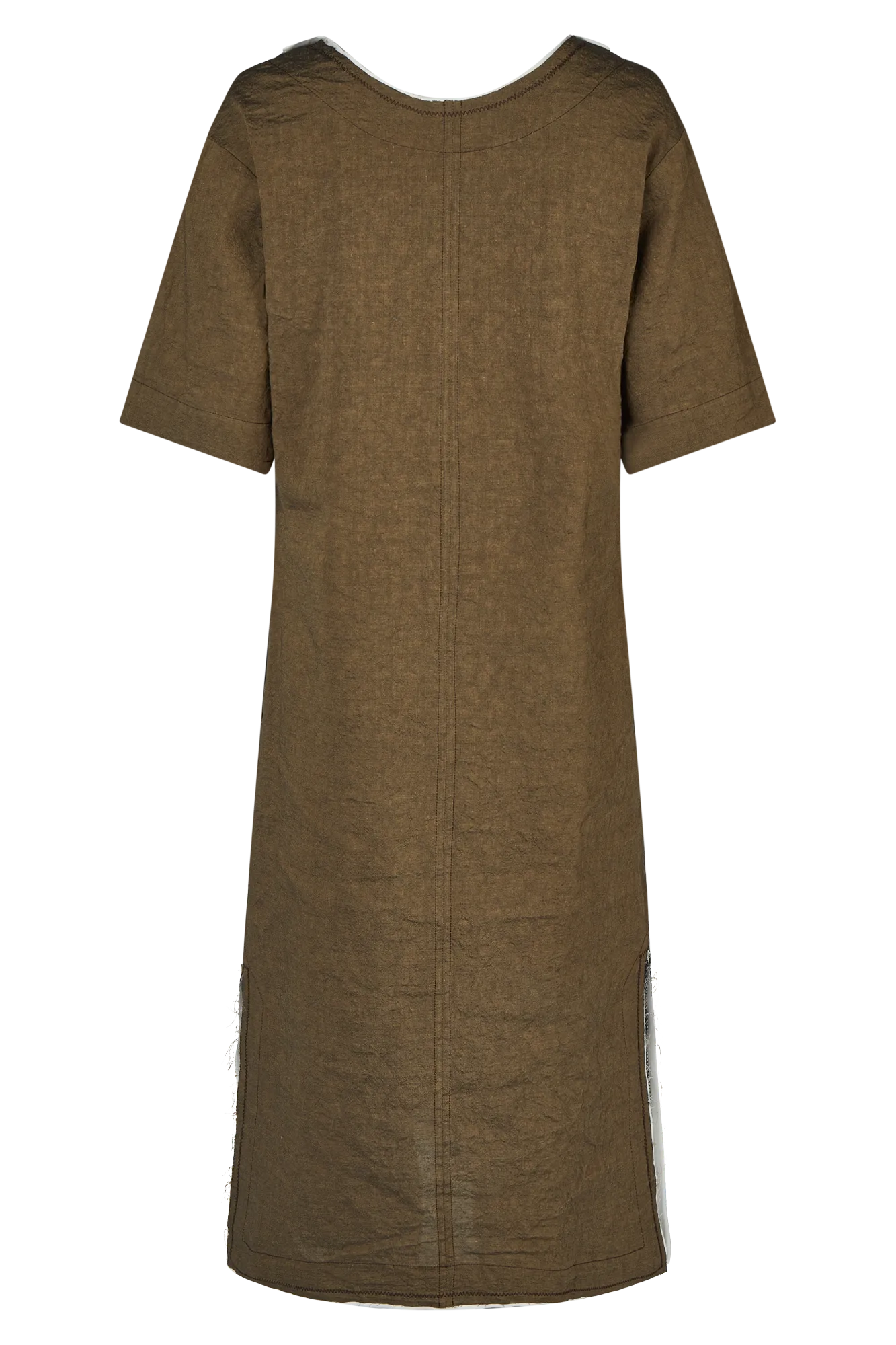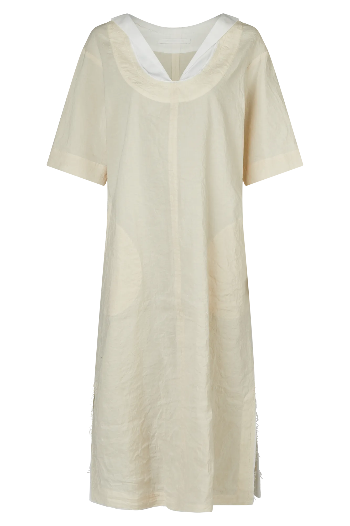 Dieses locker geschnittene Kleid kombiniert eine feminine A-Linie mit sportlichen Elementen und handwerklichem Anspruch. Offene Saumkanten mit kontrastierendem Besatz und markante Zick-Zack-Steppungen setzen dezente Akzente, während das Leinen-Baumwoll-Gewebe mit Papertouch-Struktur Leichtigkeit und Charakter verleiht.