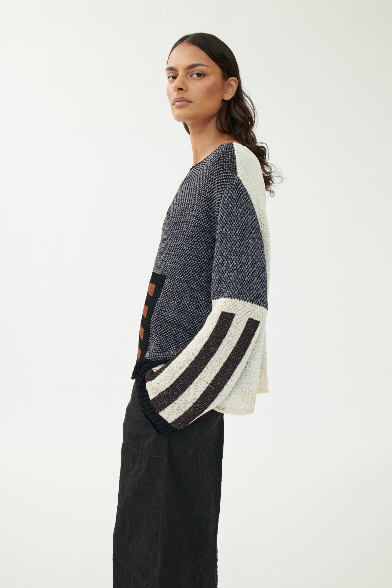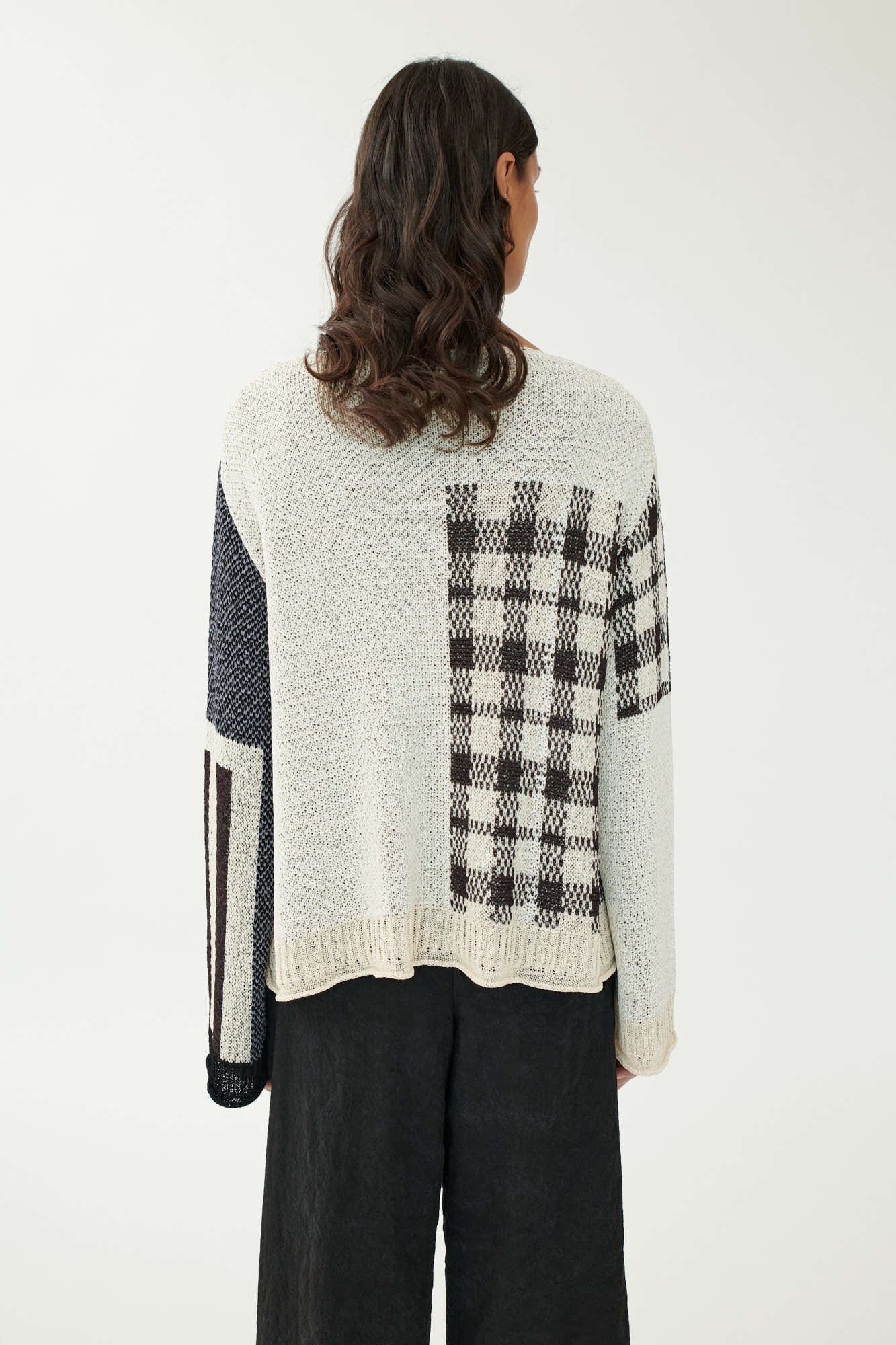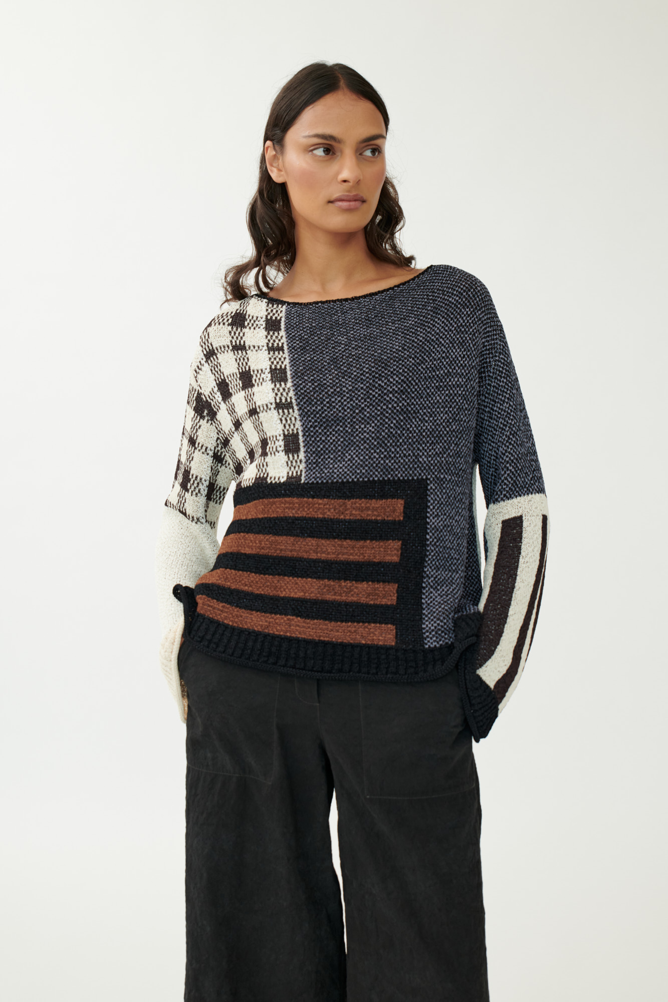 Kunstvoller Strukturmix trifft auf klare Silhouette: Dieser kastig geschnittene Pullover aus schwerer Viskose-Qualität zeigt ein grafisches Jacquardmuster in moderner Patchwork-Optik. Die glatte Oberfläche mit leicht körnigem Griff verleiht dem Design Tiefe und Präsenz. Der gerade Ausschnitt und die leicht ausgestellten Ärmel unterstreichen die klare Formensprache.