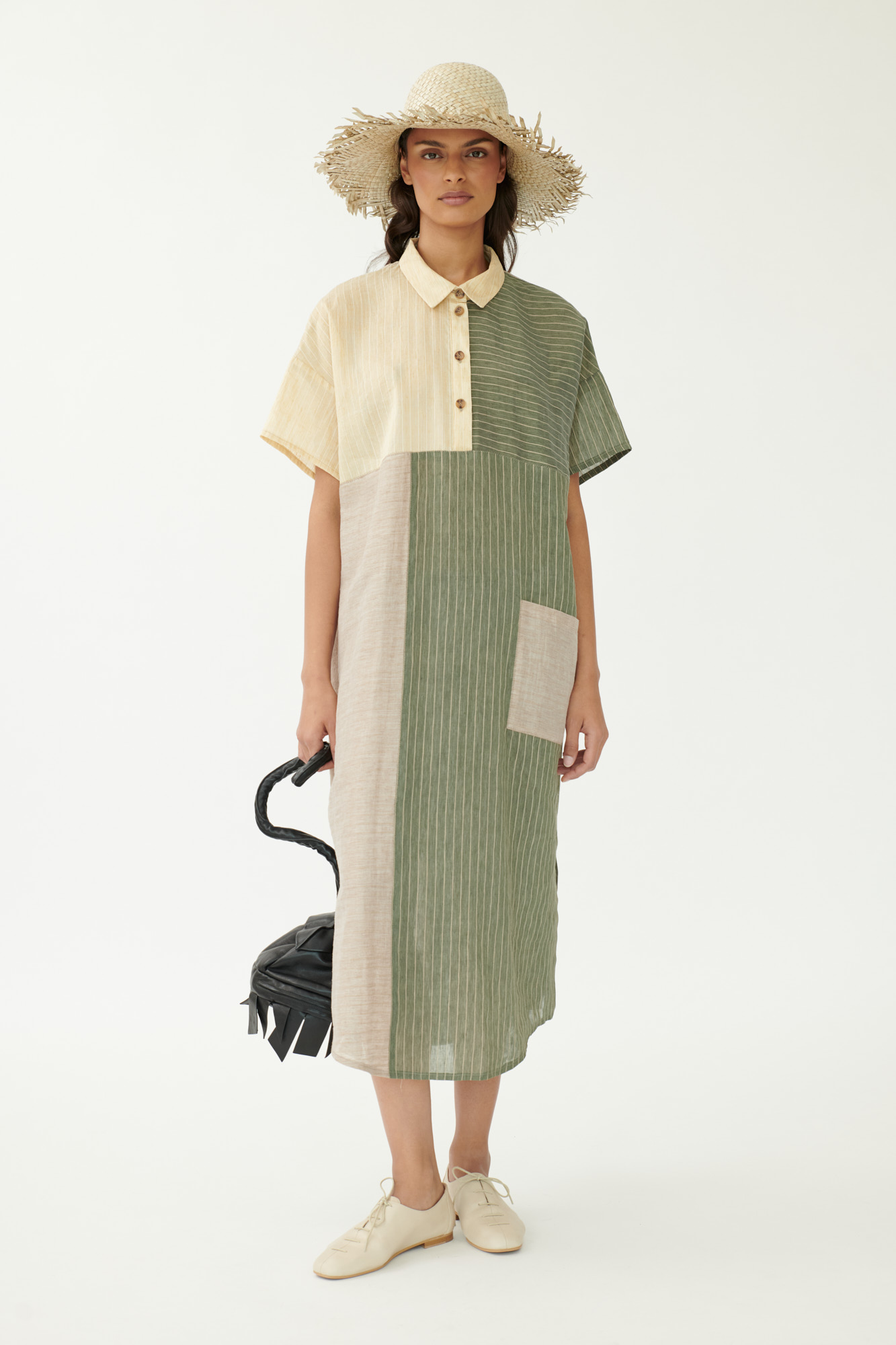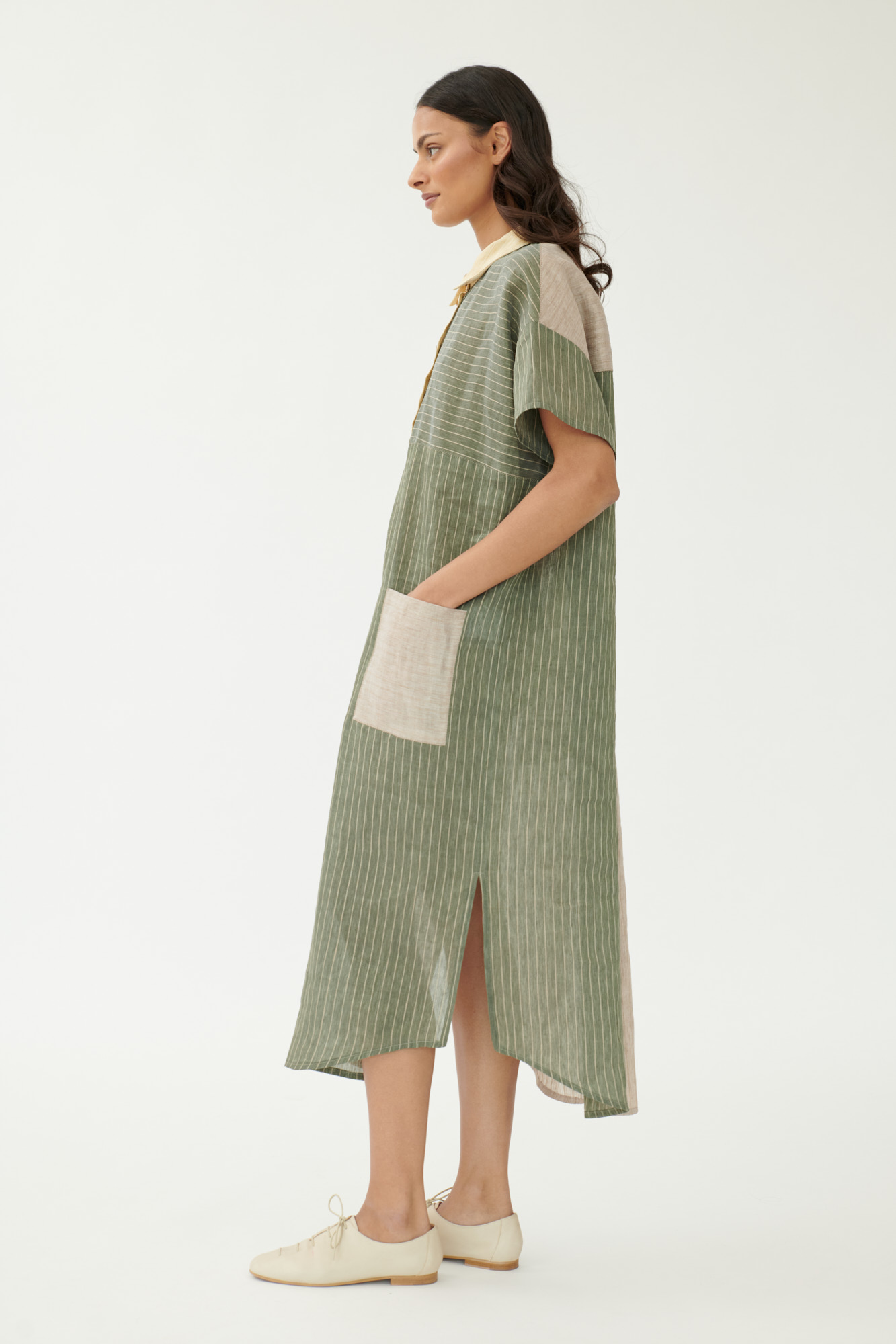 Dieses lässige Kleid kombiniert eine gerade Hemdblusenform mit grafischer Patchwork-Optik. Durch die Mischung aus vertikalen und horizontalen Streifen, dezentes Color Blocking und Zick-Zack-Steppungen entsteht ein spannendes Spiel aus Struktur und Linie. Das leichte Leinenmaterial mit Nadelstreifen fühlt sich weich an und eignet sich ideal für warme Tage.