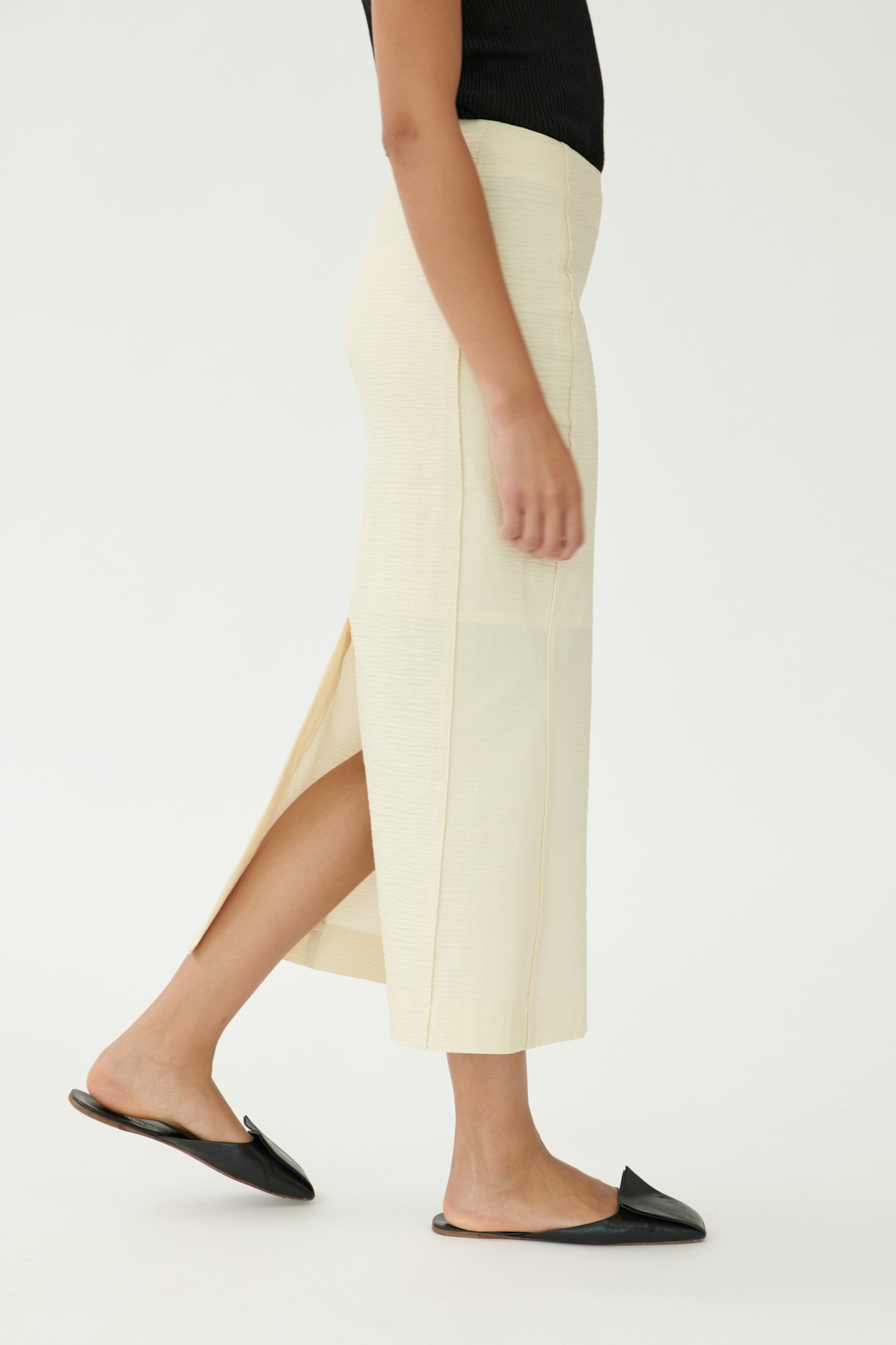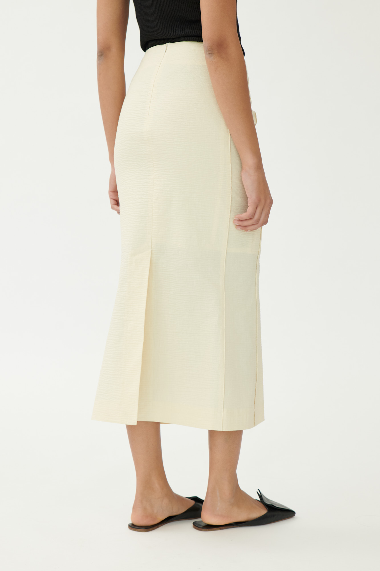 Dieser figurbetonte Rock mit ausgestelltem Saum setzt auf klare Linien und eine moderne Silhouette. Die akzentuierten Teilungsnähte formen eine Sanduhr-Linie, während das elastische Leinenmaterial mit sportlichem Charakter Bewegungsfreiheit und Struktur verleiht.