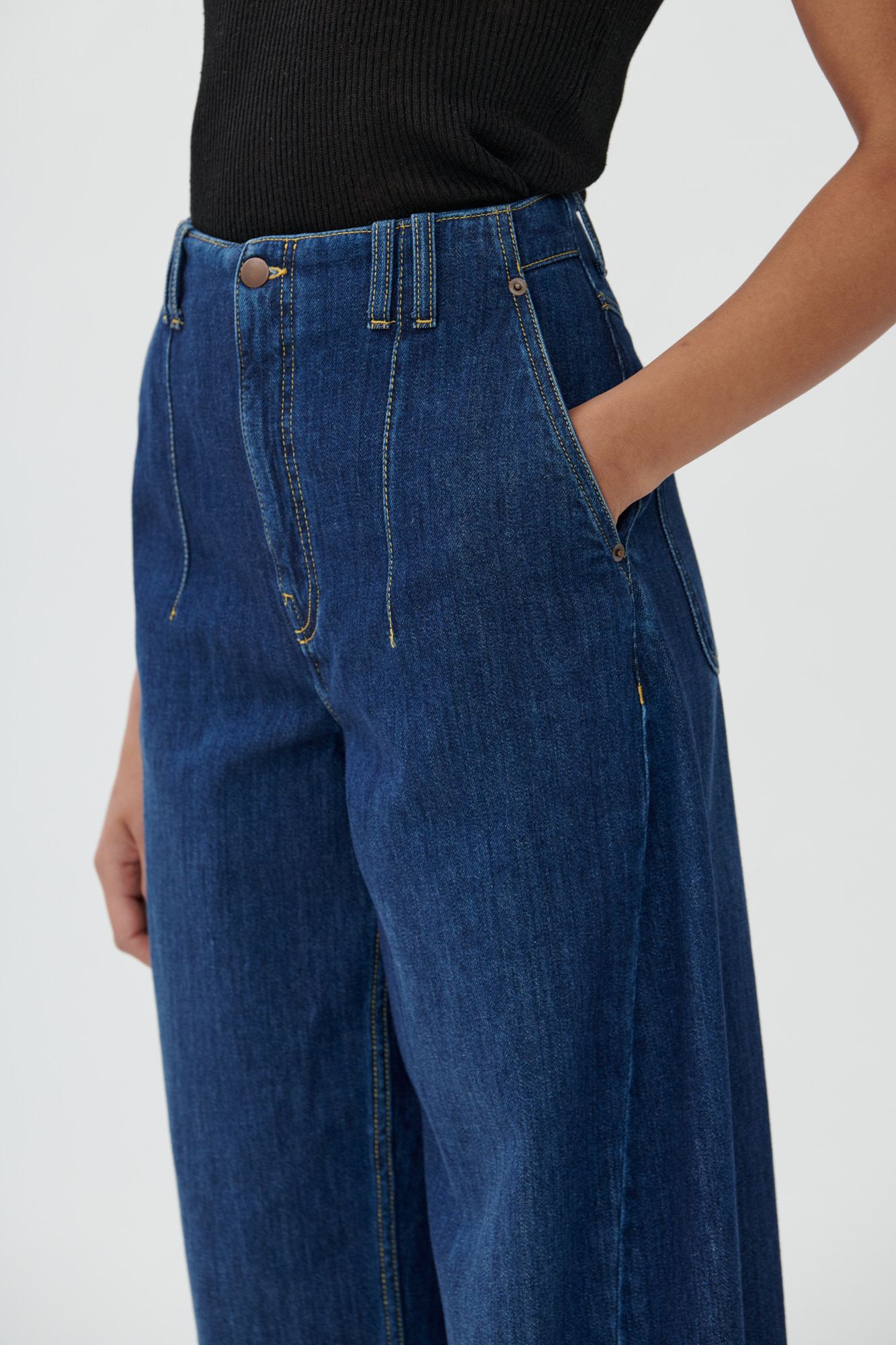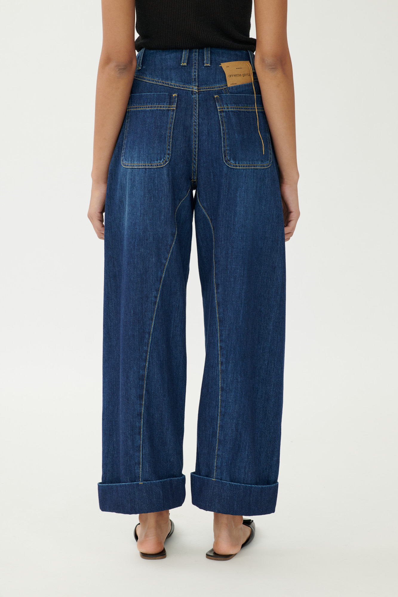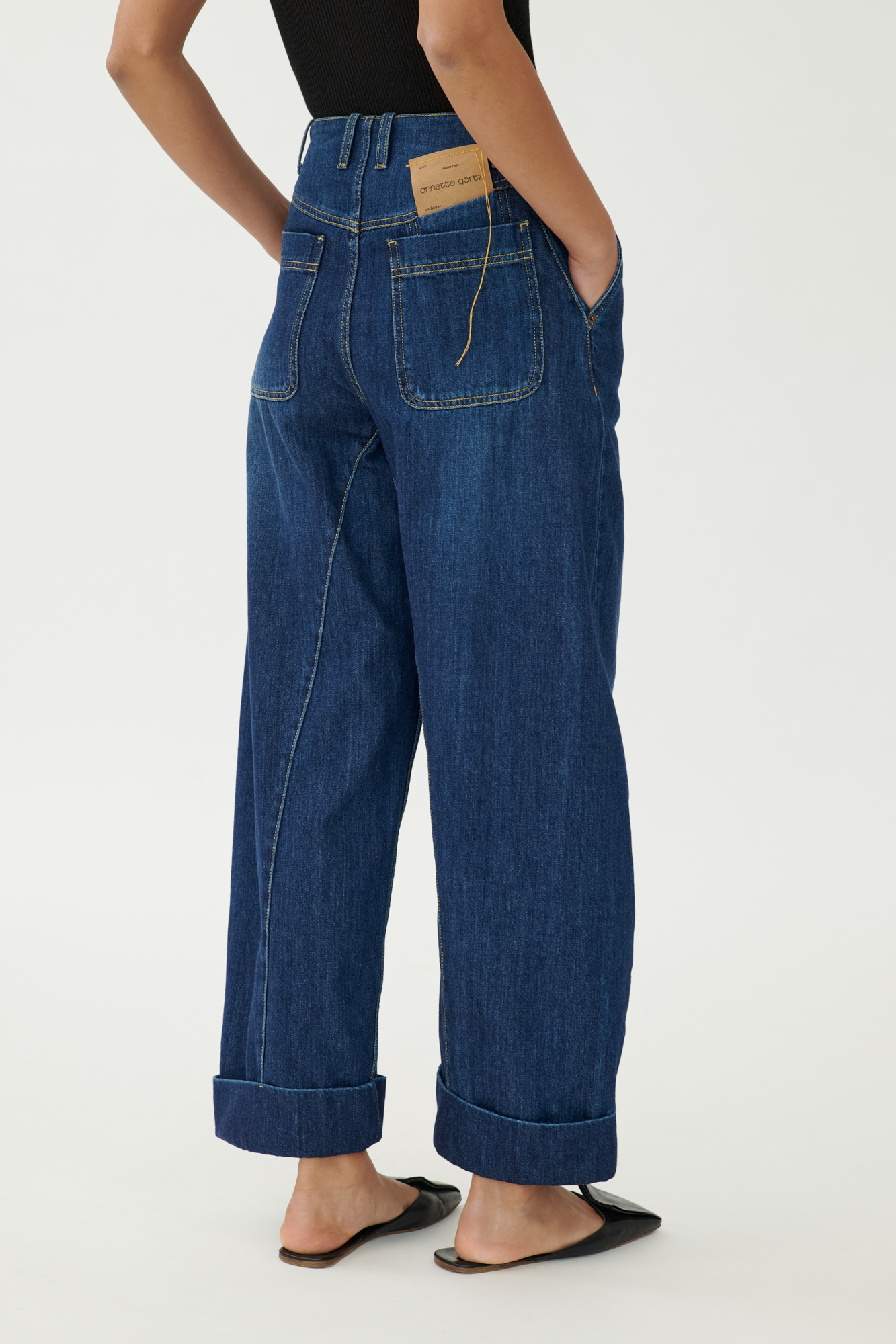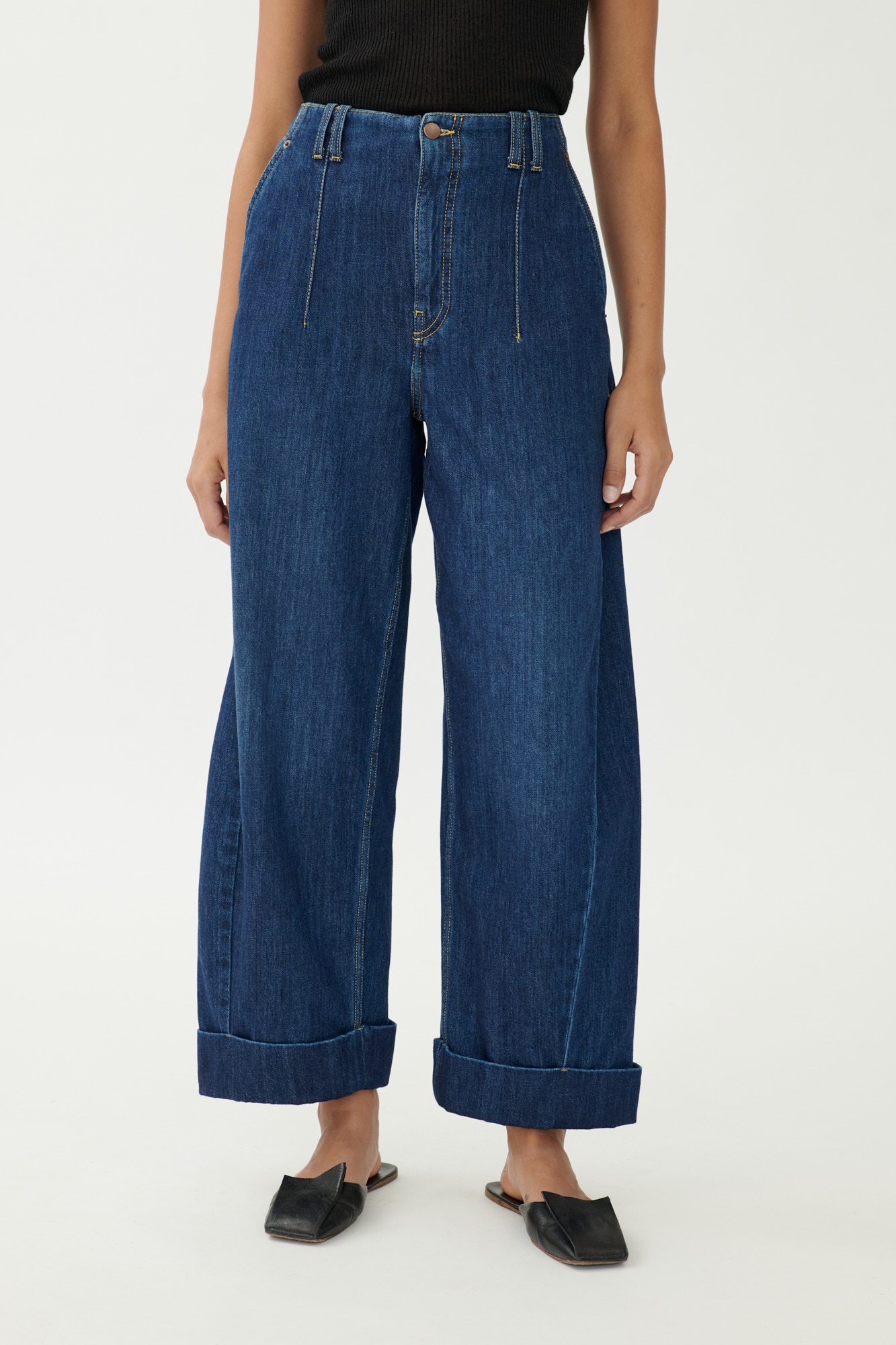 Diese lässige Jeans verbindet klassische Denim-Elemente mit einer modernen Barrel-Silhouette. Lange Abnäher vorn, formgebende Teilungsnähte und sportliche Steppdetails sorgen für eine klare Linienführung. Der Umschlag am Saum unterstreicht den entspannten Look. Gefertigt aus weichem Baumwoll-Denim mit natürlichem Griff.