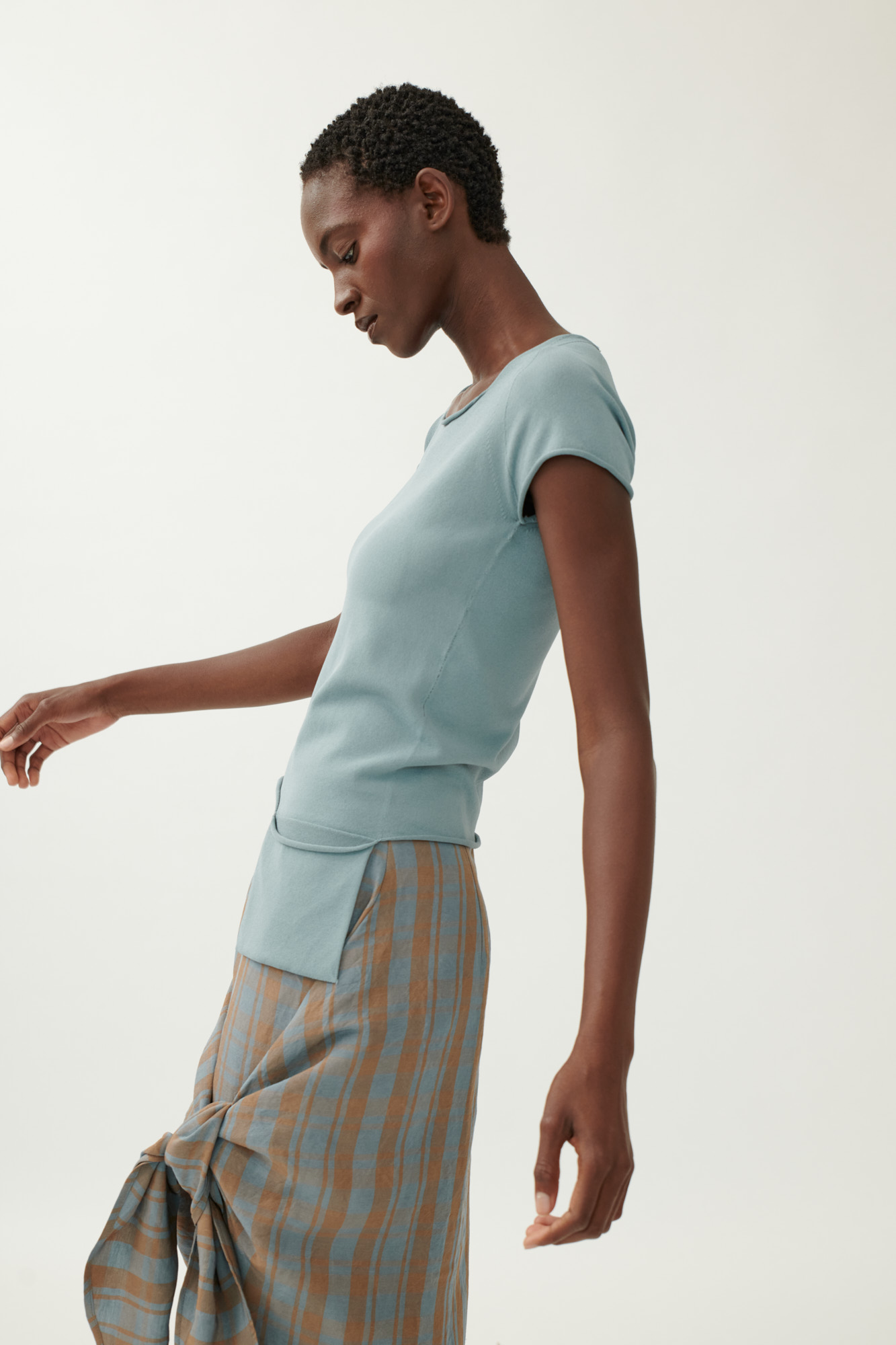 Minimalistisch, funktional, nachhaltig. Dieses fein gestrickte T-Shirt besticht durch eine klare Linienführung und moderne Details wie die angestrickte Eingriffstasche und Rollkanten an den Säumen. Der kastige Ausschnitt und der kurze Raglan-Arm verleihen dem Design Leichtigkeit. Dank des kühlenden Viskosegarns und der nahtlosen Verarbeitung trägt sich das Shirt besonders angenehm – auch bei sommerlichen Temperaturen.