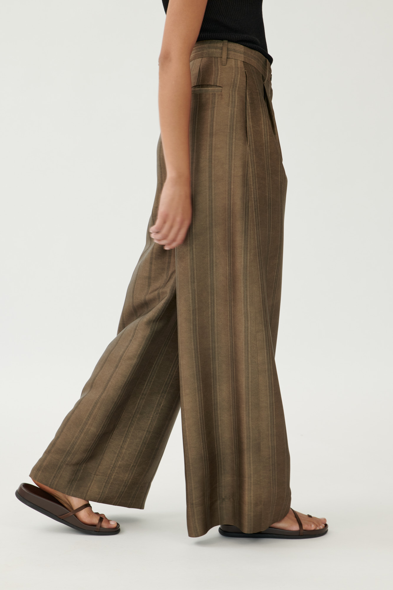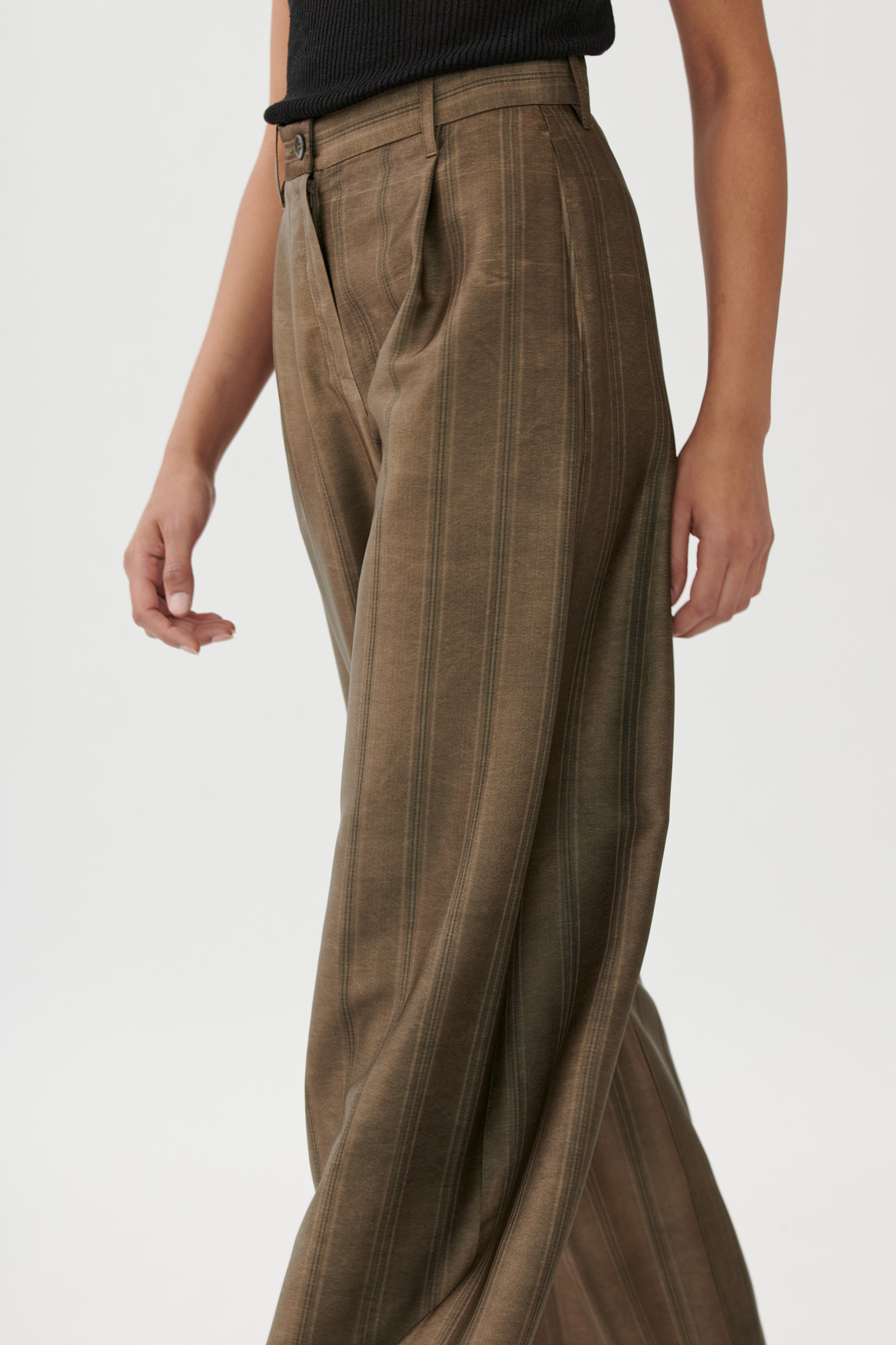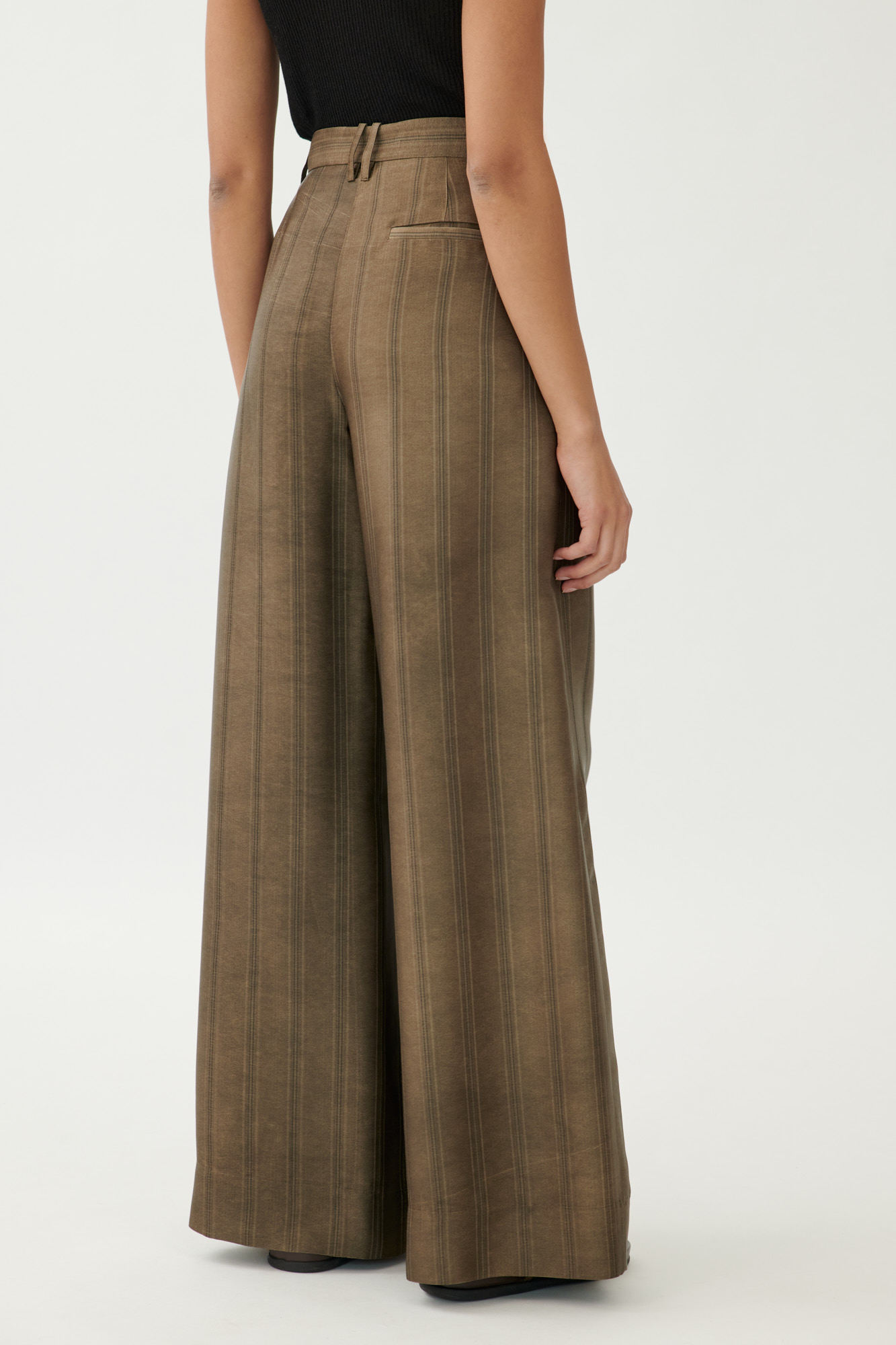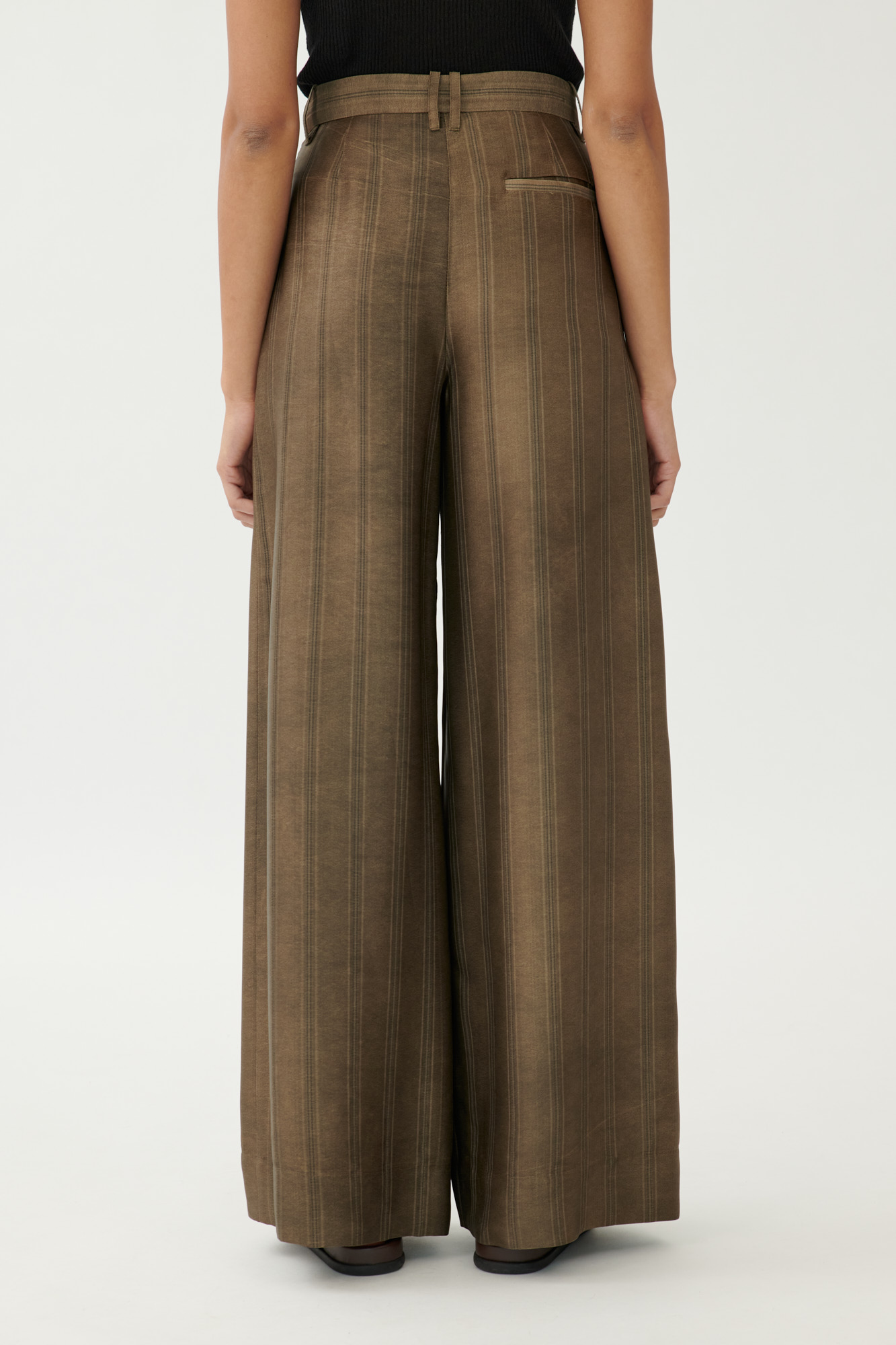 Diese locker geschnittene Hose verbindet klassische Eleganz mit moderner Materialität. Die feine Streifenstruktur wird durch die dezente Colddye-Färbung betont, das Material wirkt leicht glänzend und weich fließend. Kleine Bundfalten und eine klare Linienführung sorgen für eine zeitlose Silhouette mit komfortablem Sitz.