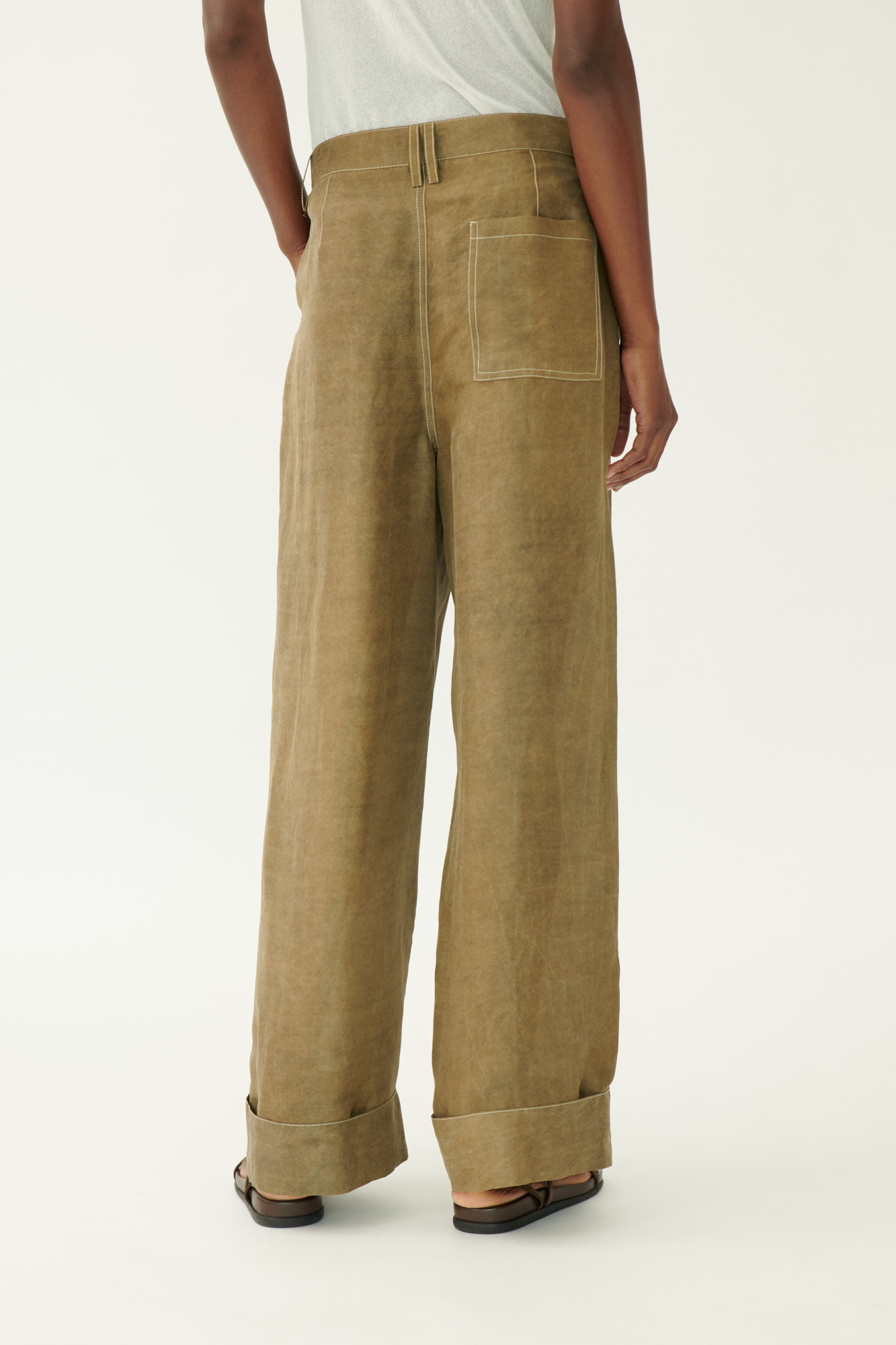 Diese weit geschnittene Hose vereint den klassischen Five-Pocket-Stil mit luxuriösem Material. Die mehrfach gefärbte Crêpe-Seide sorgt für Tiefe und Lebendigkeit im Farbton. Sportliche Steppdetails und der lässige Umschlag am Saum unterstreichen den modernen Charakter.