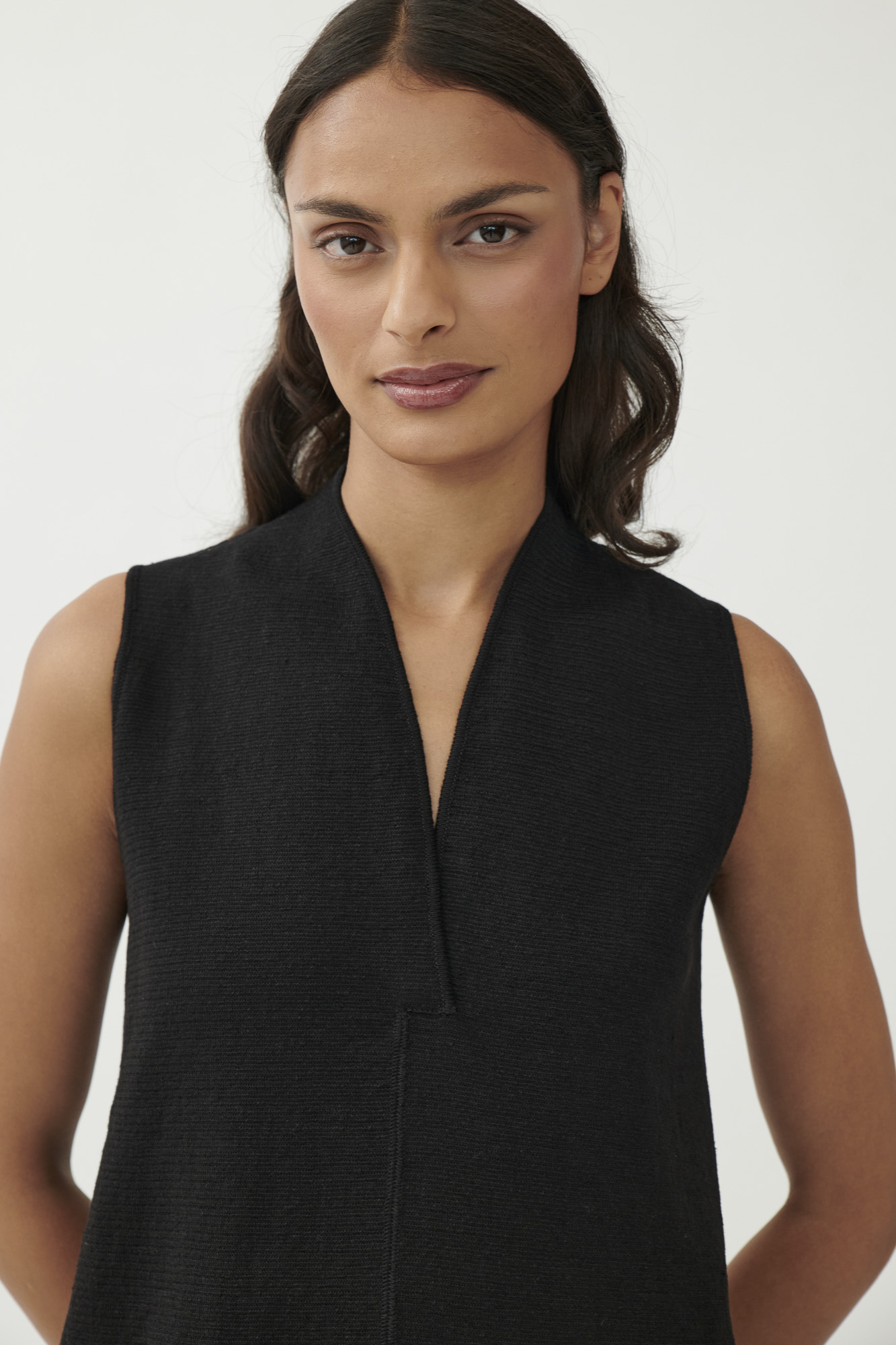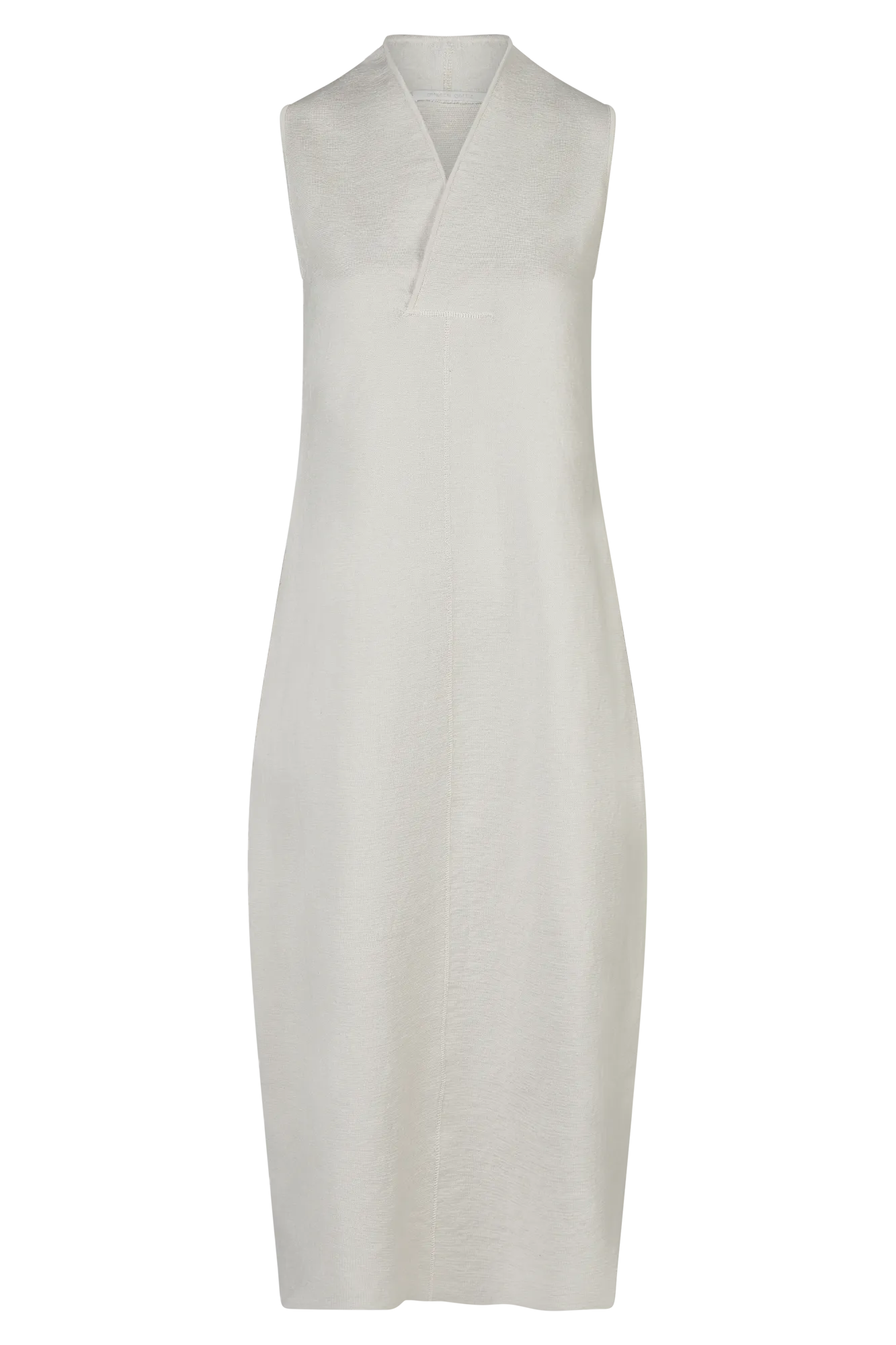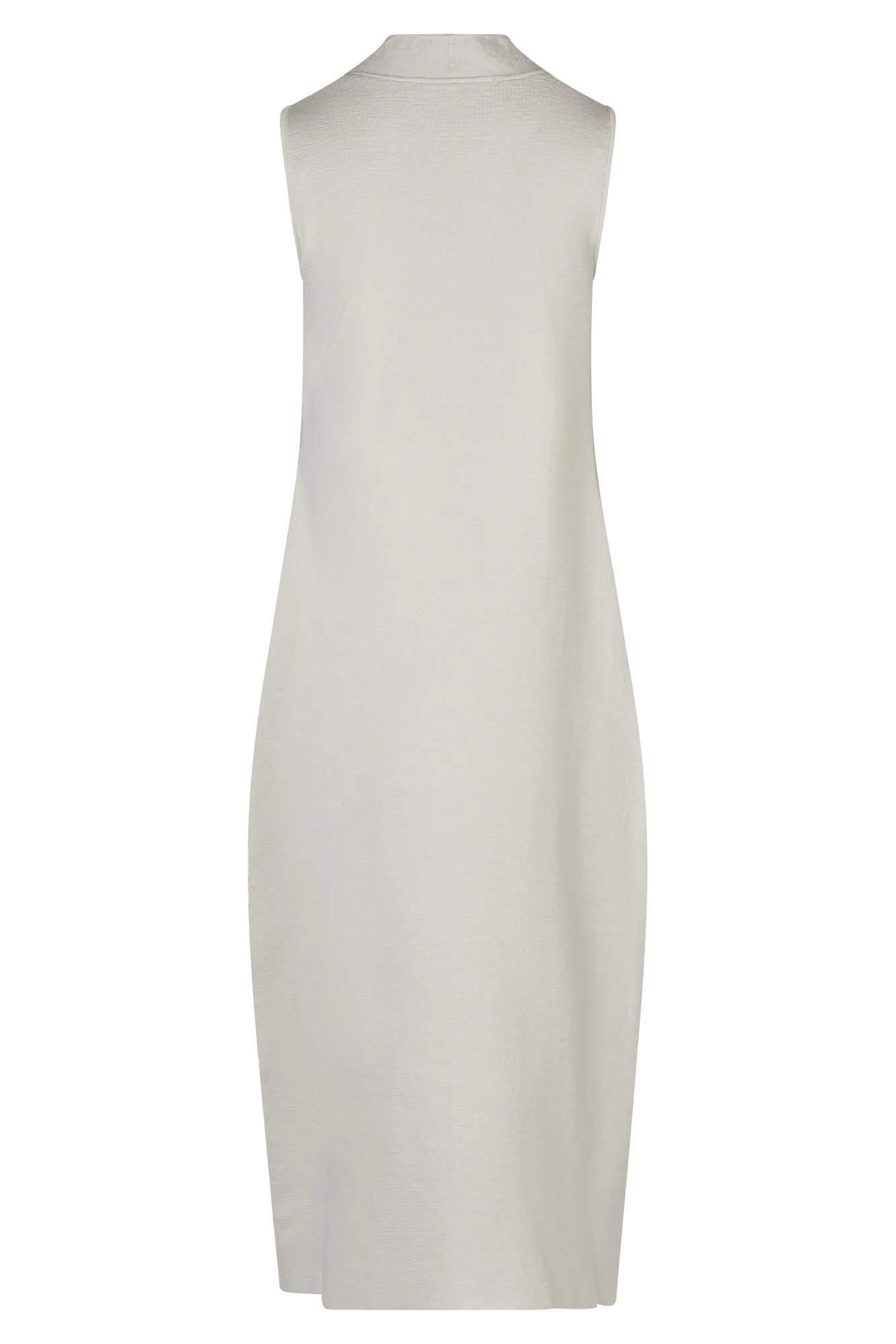 Ein reduziertes Design mit subtilem Volumen: Dieses ärmellose Strickkleid überzeugt durch klare Linien und fein strukturierte Materialität. Der feste Milano-Strick aus Leinen und Seide formt eine moderne Silhouette – körpernah an Brust und Saum, mit leicht ausgestelltem Bein in O-Form. Der kurze Stehkragen läuft in einen tiefen V-Ausschnitt aus und sorgt für einen markanten, aber femininen Abschluss.