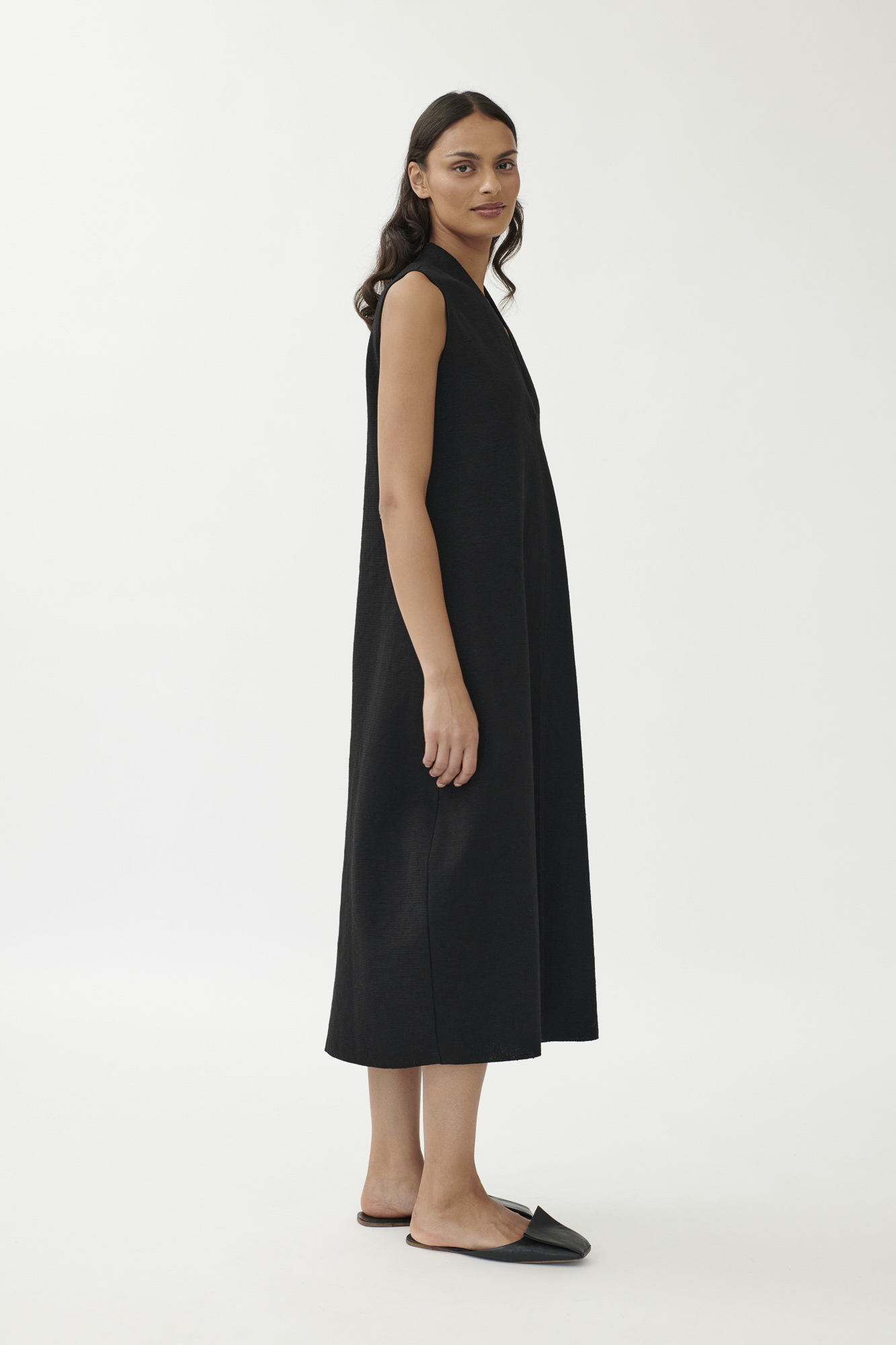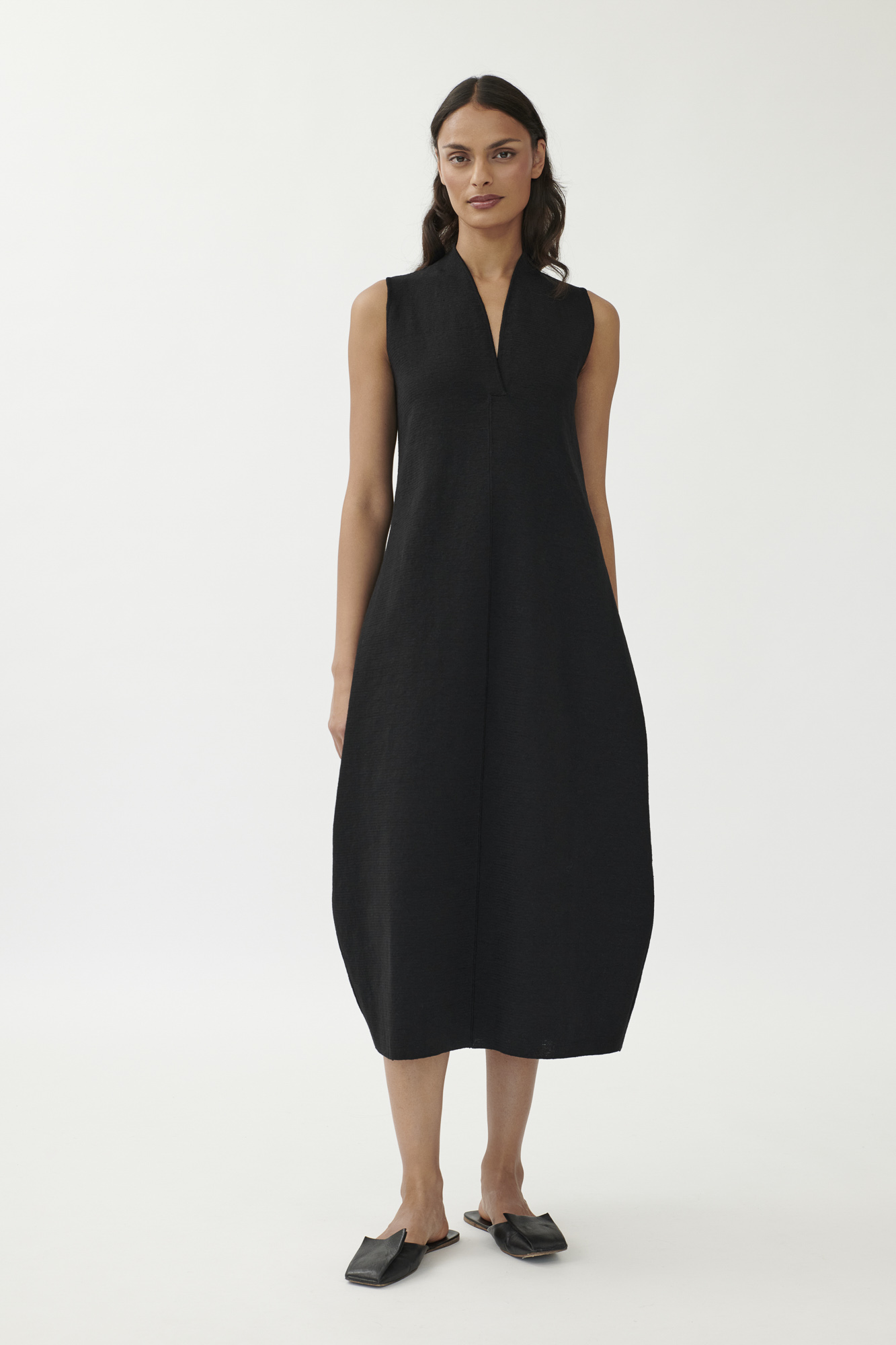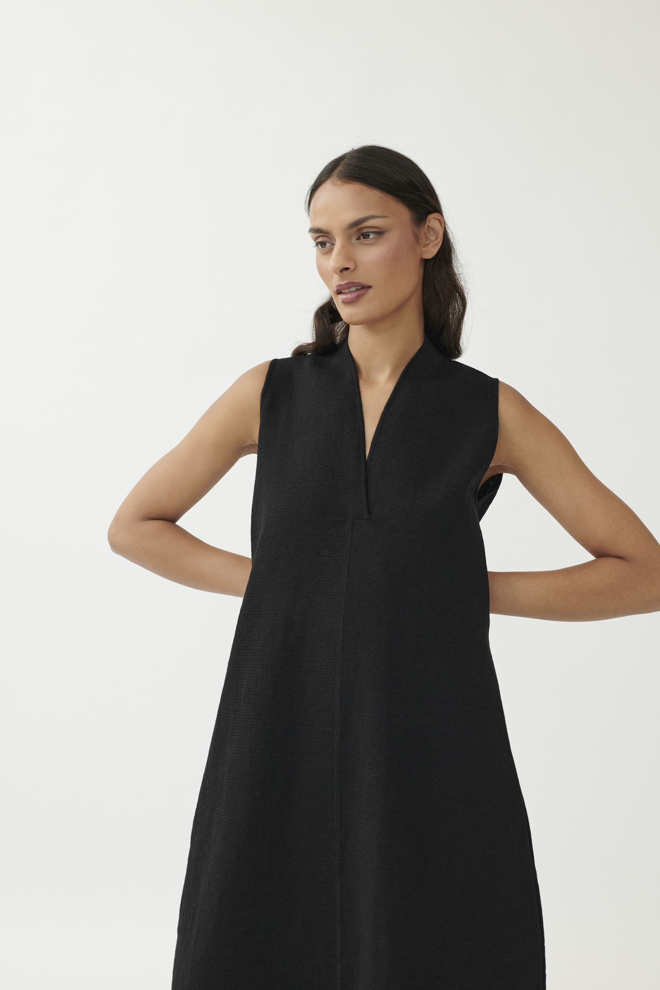 Ein reduziertes Design mit subtilem Volumen: Dieses ärmellose Strickkleid überzeugt durch klare Linien und fein strukturierte Materialität. Der feste Milano-Strick aus Leinen und Seide formt eine moderne Silhouette – körpernah an Brust und Saum, mit leicht ausgestelltem Bein in O-Form. Der kurze Stehkragen läuft in einen tiefen V-Ausschnitt aus und sorgt für einen markanten, aber femininen Abschluss.