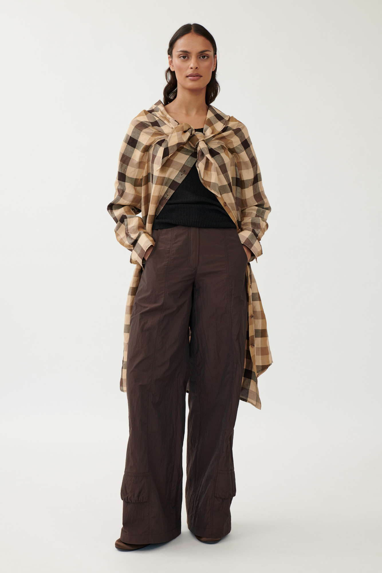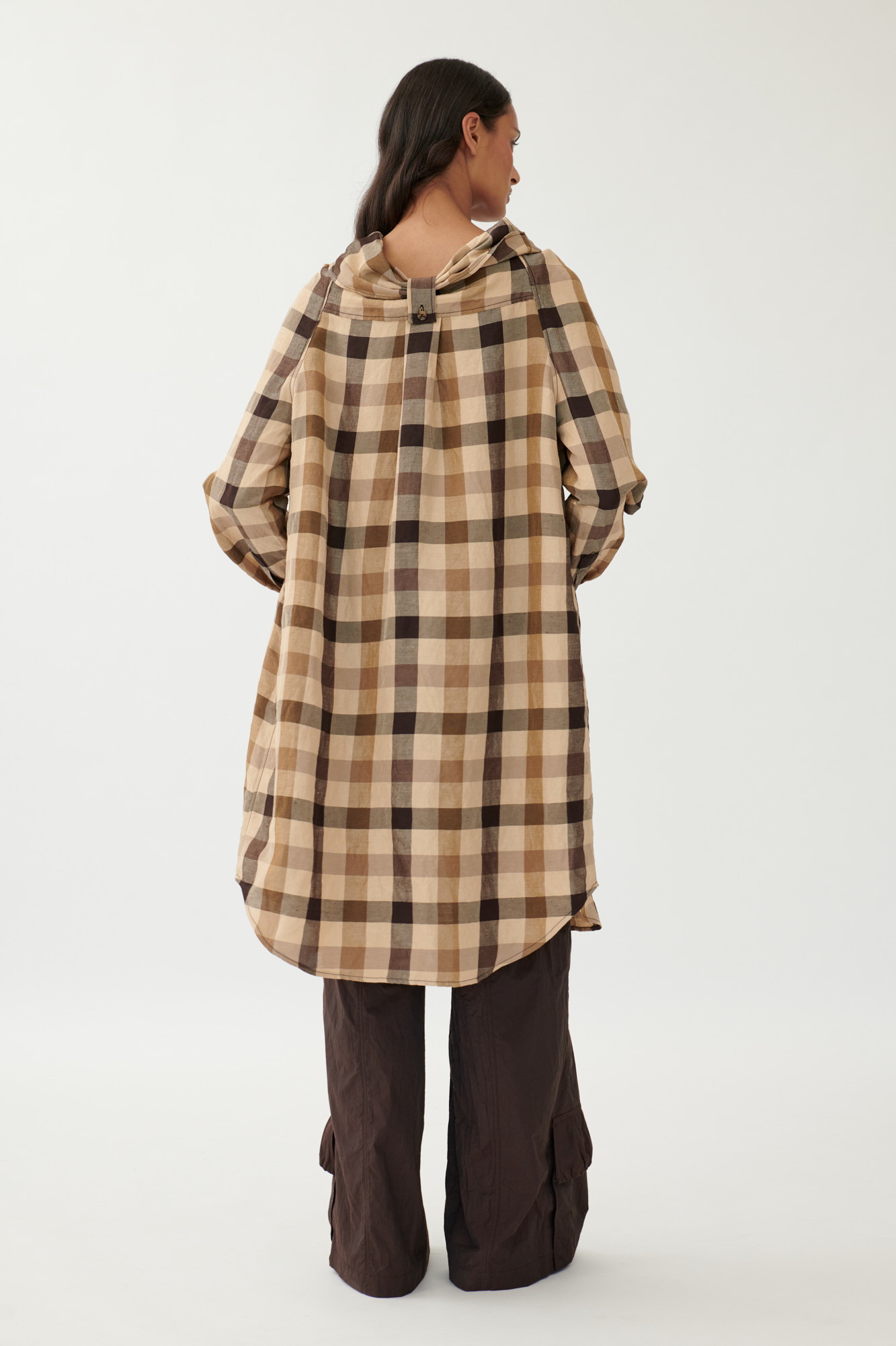 Lässiges, oversized Blusenkleid mit besonderem Kragendetail. Der weich fallende, geknotete Ausschnitt bringt eine neue Interpretation klassischer Hemdformen. Das karierte Material aus Leinen und Viskose überzeugt mit angenehmer Haptik und gewaschener Optik.