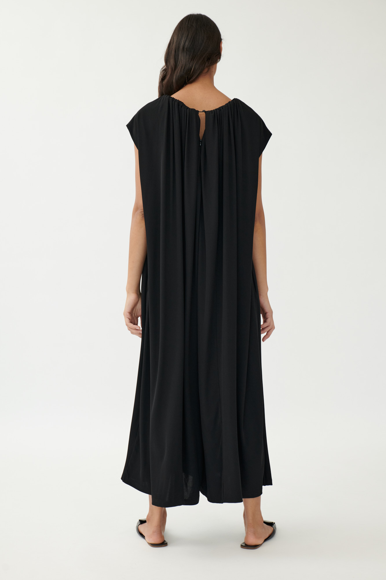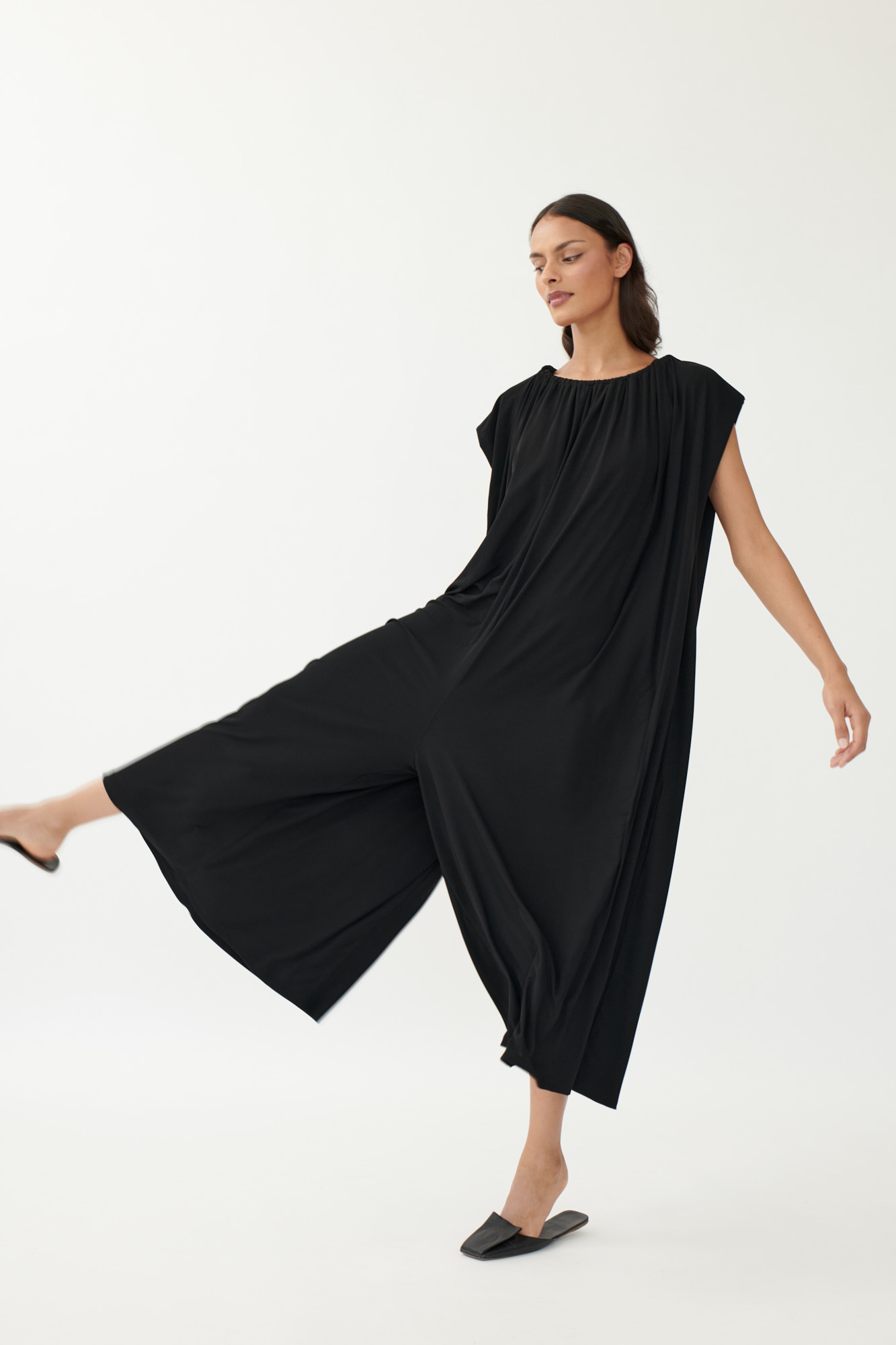 Lässiger Einteiler aus fließendem Viskose-Jersey. Der weich fallende Rundhalsausschnitt mit Schlitz und Reißverschluss sorgt für Komfort beim Anziehen. Überschnittene Schultern und gerade, lange Beine unterstreichen die entspannte Silhouette. Ein unkompliziertes Kleidungsstück für vielseitige Looks.