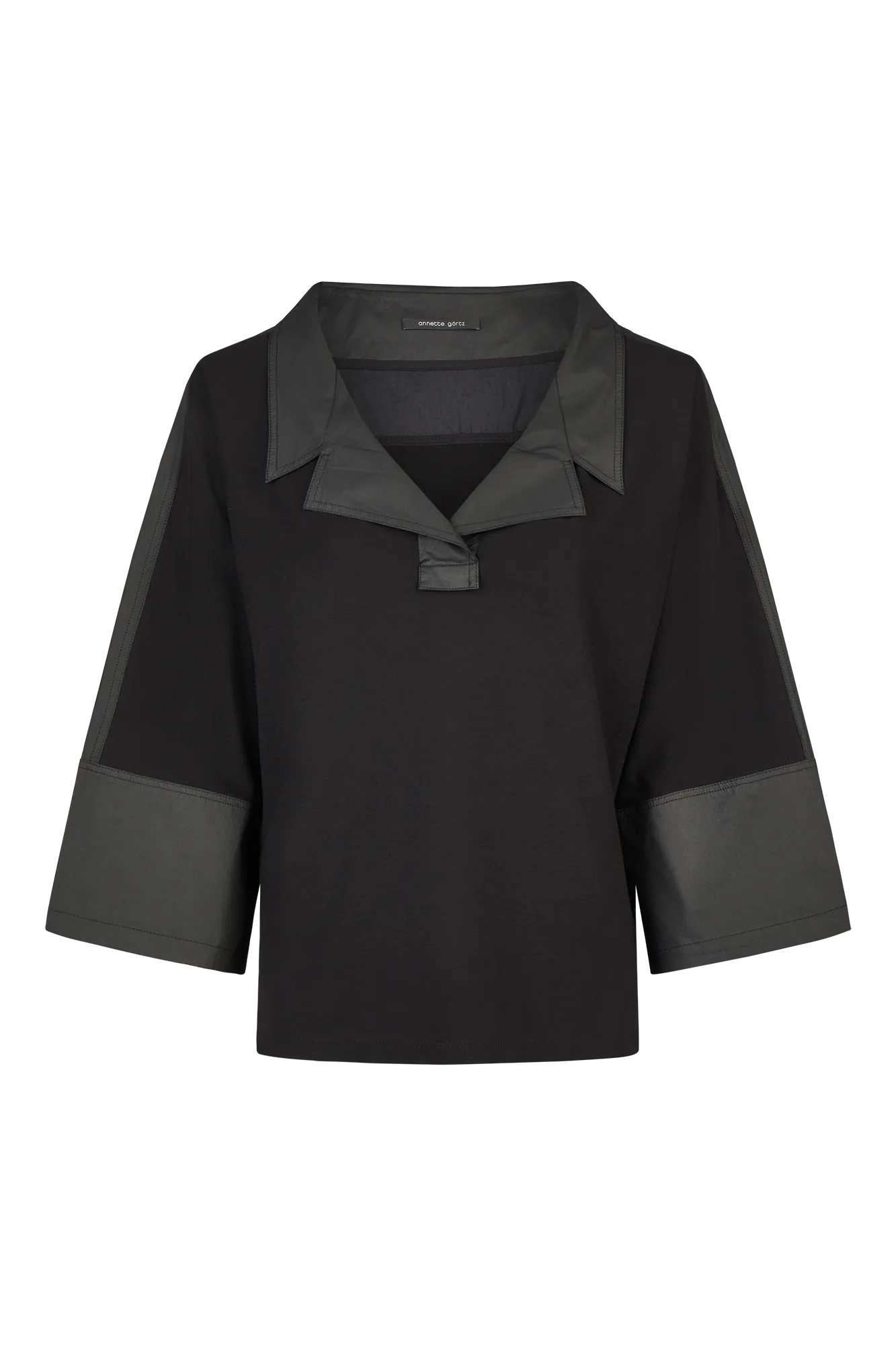 Diese modern interpretierte Polo-Bluse vereint eine klare Silhouette mit spannenden Materialkontrasten. Die Vorderseite aus beschichtetem Popelin wirkt strukturiert und grafisch, die Rückseite aus weichem Crêpe-Jersey bringt Bewegung ins Design. Ein klassischer Reverskragen mit V-Ausschnitt und krempelbare Ärmel unterstreichen den entspannten Look.