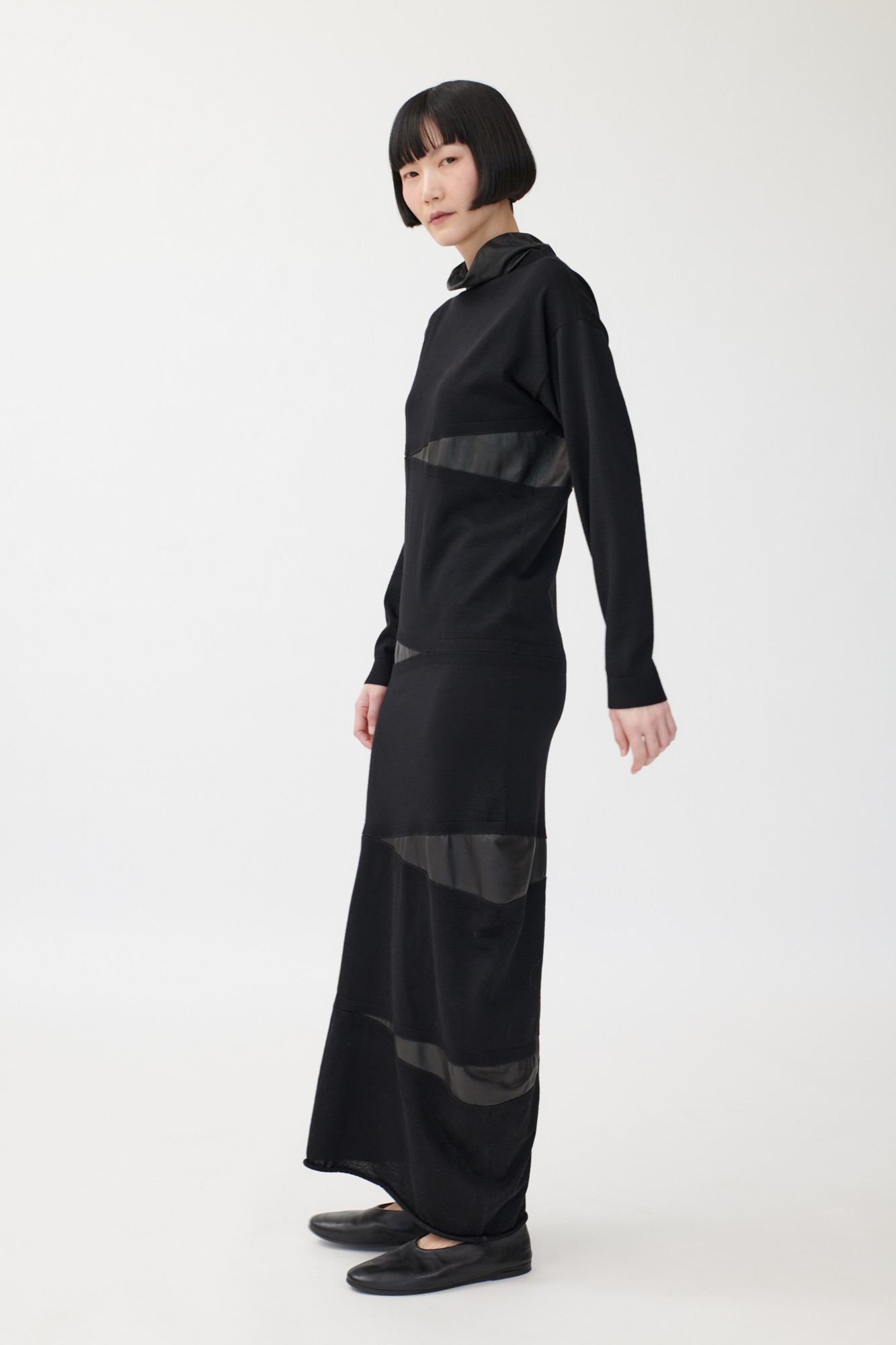 Asymmetric knitted dress made from merino wool with leather inserts.