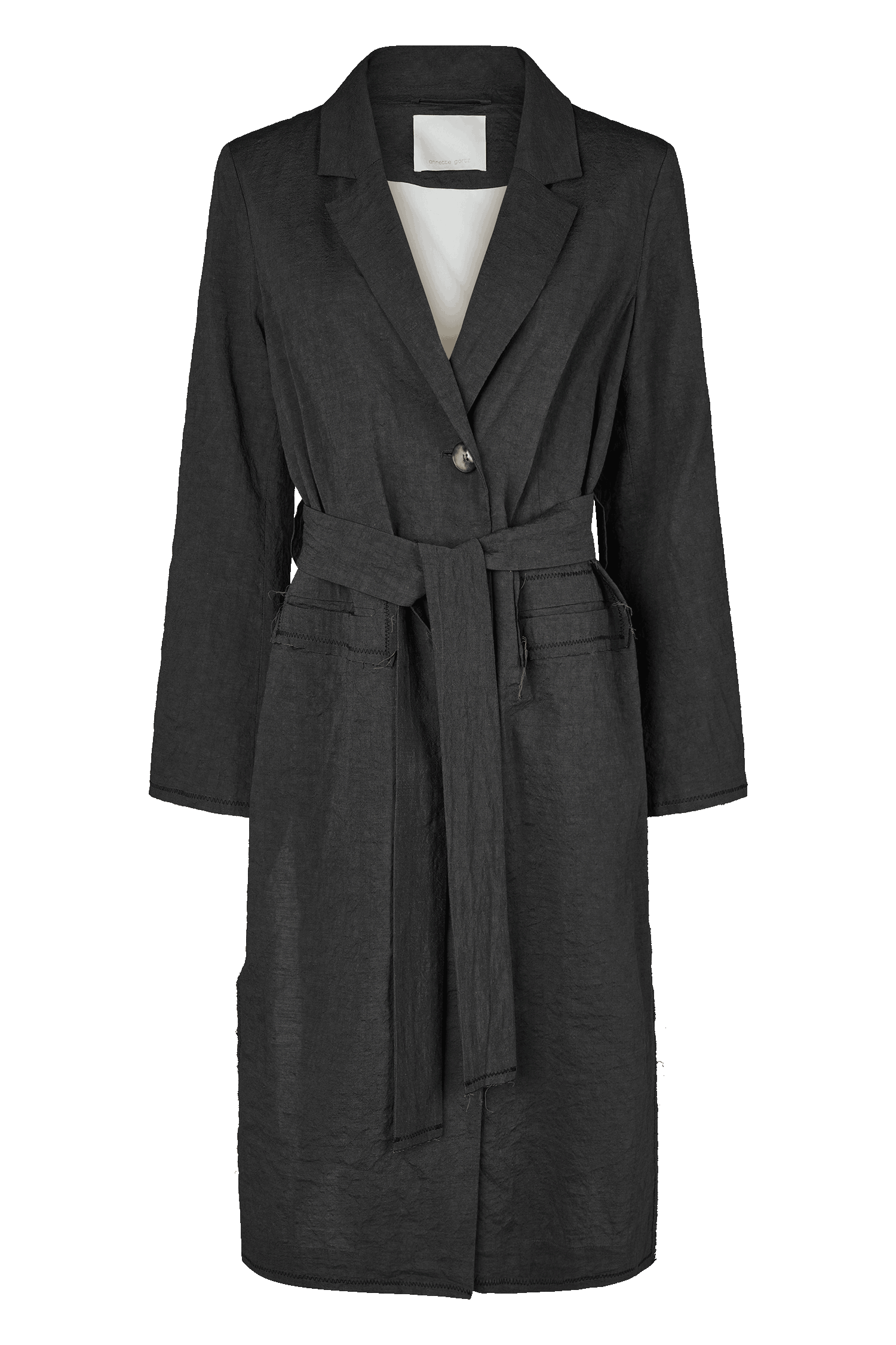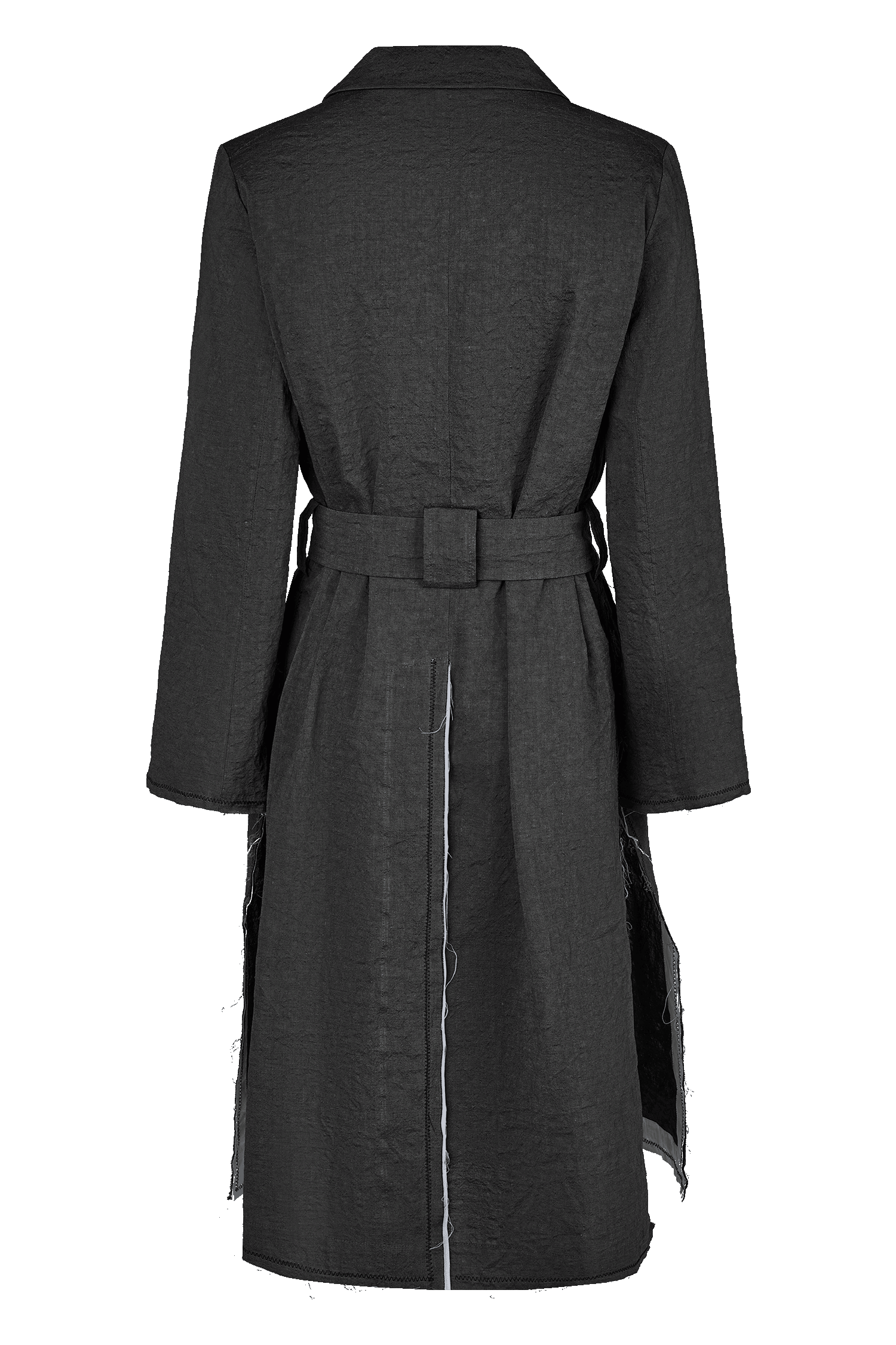 This straight-cut coat blends clean lines with subtle nods to craftsmanship. Raw-edge finishes with contrast trim, flared sleeves, and bold zigzag stitching reference traditional tailoring techniques while adding a sculptural character. The washed linen-cotton fabric offers structure with a soft, natural feel.