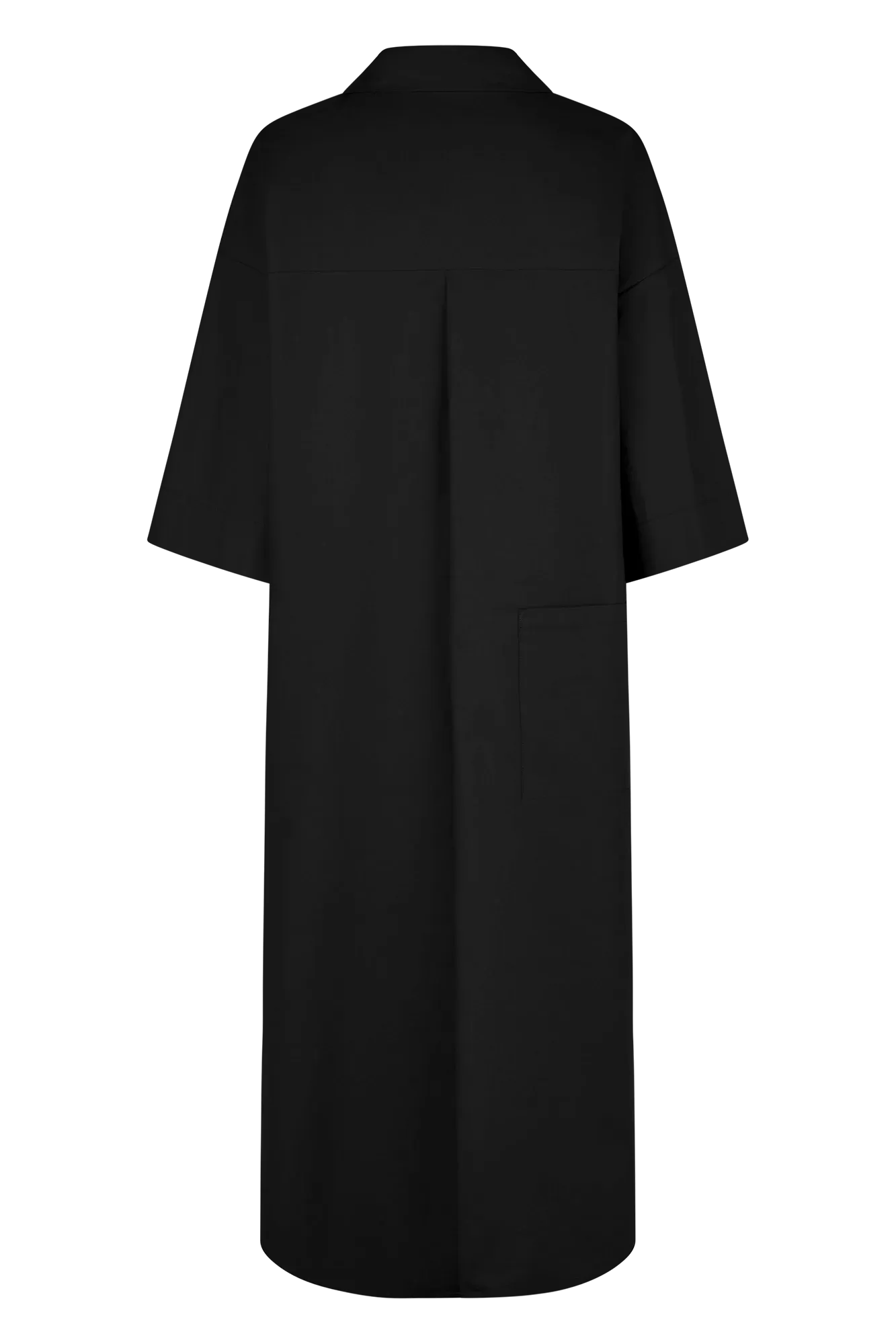 This long, straight-cut shirt dress reinterprets a classic silhouette with modern construction. Featuring a deconstructed notch collar, full button placket, and functional pockets, it’s crafted from lightly elasticated poplin with a matte coated finish that adds structure and a technical touch.