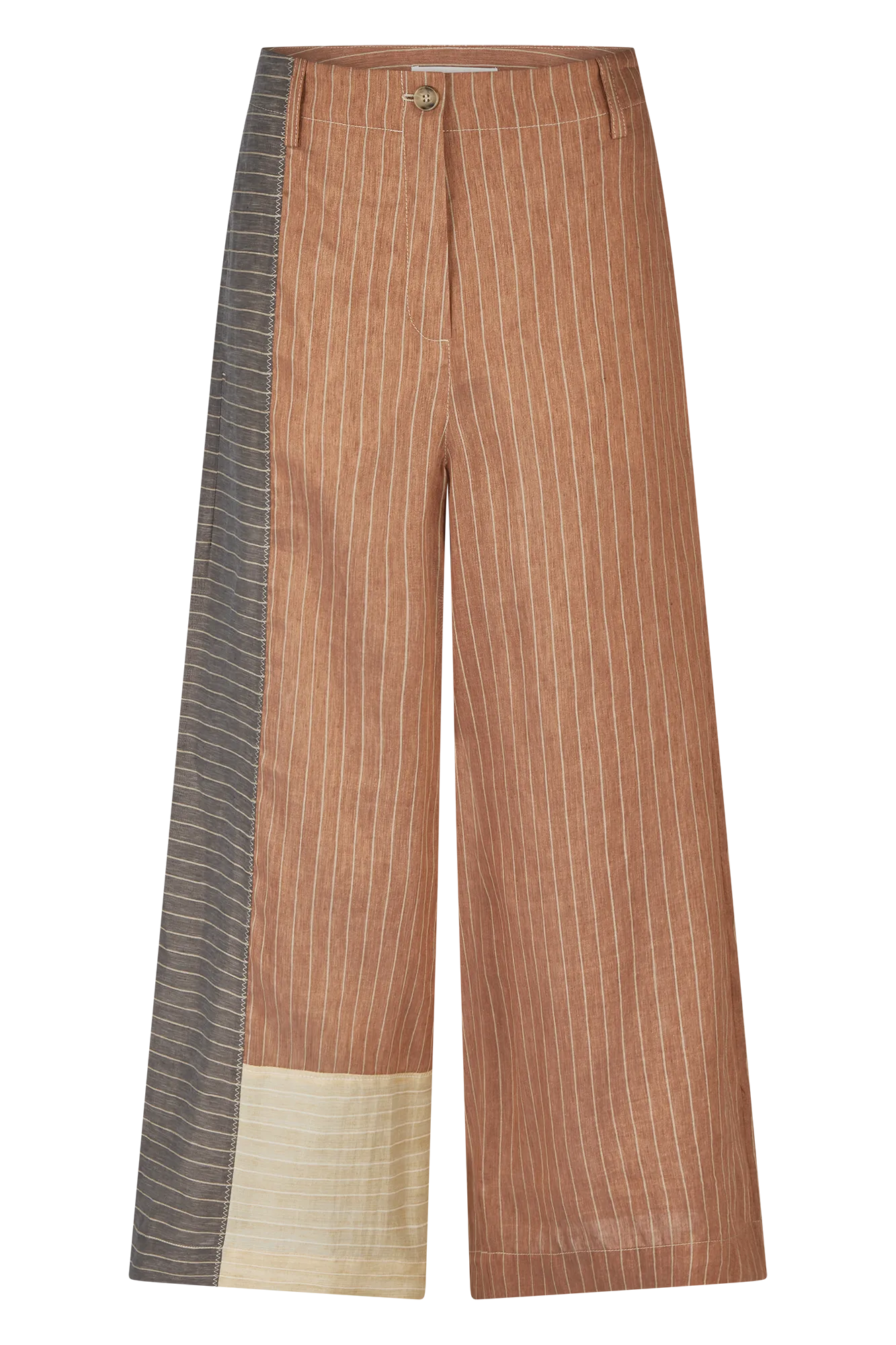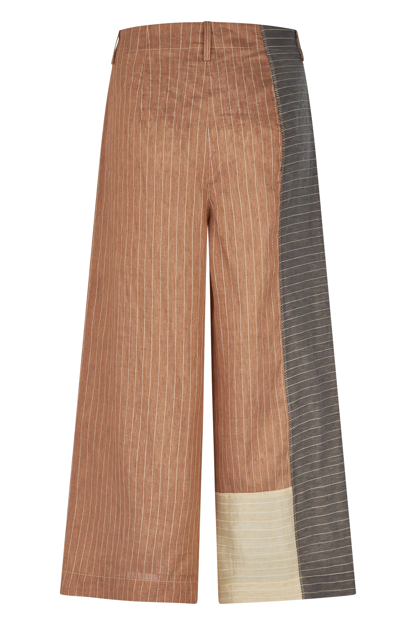 This wide-leg culotte features a graphic stripe mix with subtle color blocking and artisanal zigzag topstitching. The lightweight linen blend with fine pinstripes adds a soft, fluid drape—ideal for warmer days and elevated casual looks.